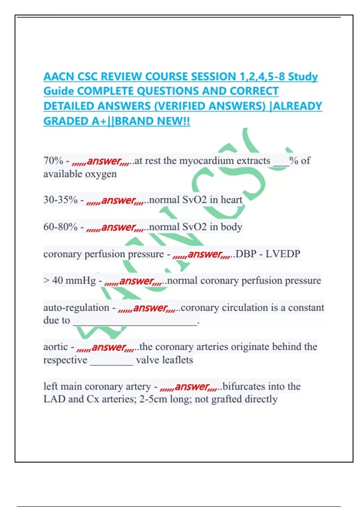 AACN CSC REVIEW COURSE SESSION 1,2,4,5-8 Study Guide COMPLETE QUESTIONS AND CORRECT DETAILED ANSWERS (VERIFIED ANSWERS) |ALREADY GRADED A+||BRAND NEW!! 70% - ,,,,,,answer,,,,..at rest the myocardium extracts ___% of available oxygen