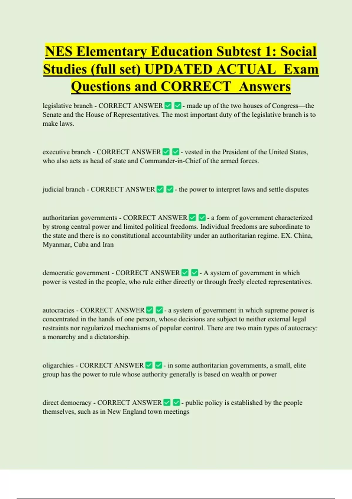 NES Elementary Education Subtest 1: Social Studies (full set) UPDATED ACTUAL Exam Questions and CORRECT Answers legislative branch - CORRECT ANSWER - made up of the two houses of Congress—the Senate and the House of Representatives. The most important duty of the legislative branch is to make laws. executive branch - CORRECT ANSWER - vested in the President of the United States, who also acts as head of state and Commander-in-Chief of the armed forces.