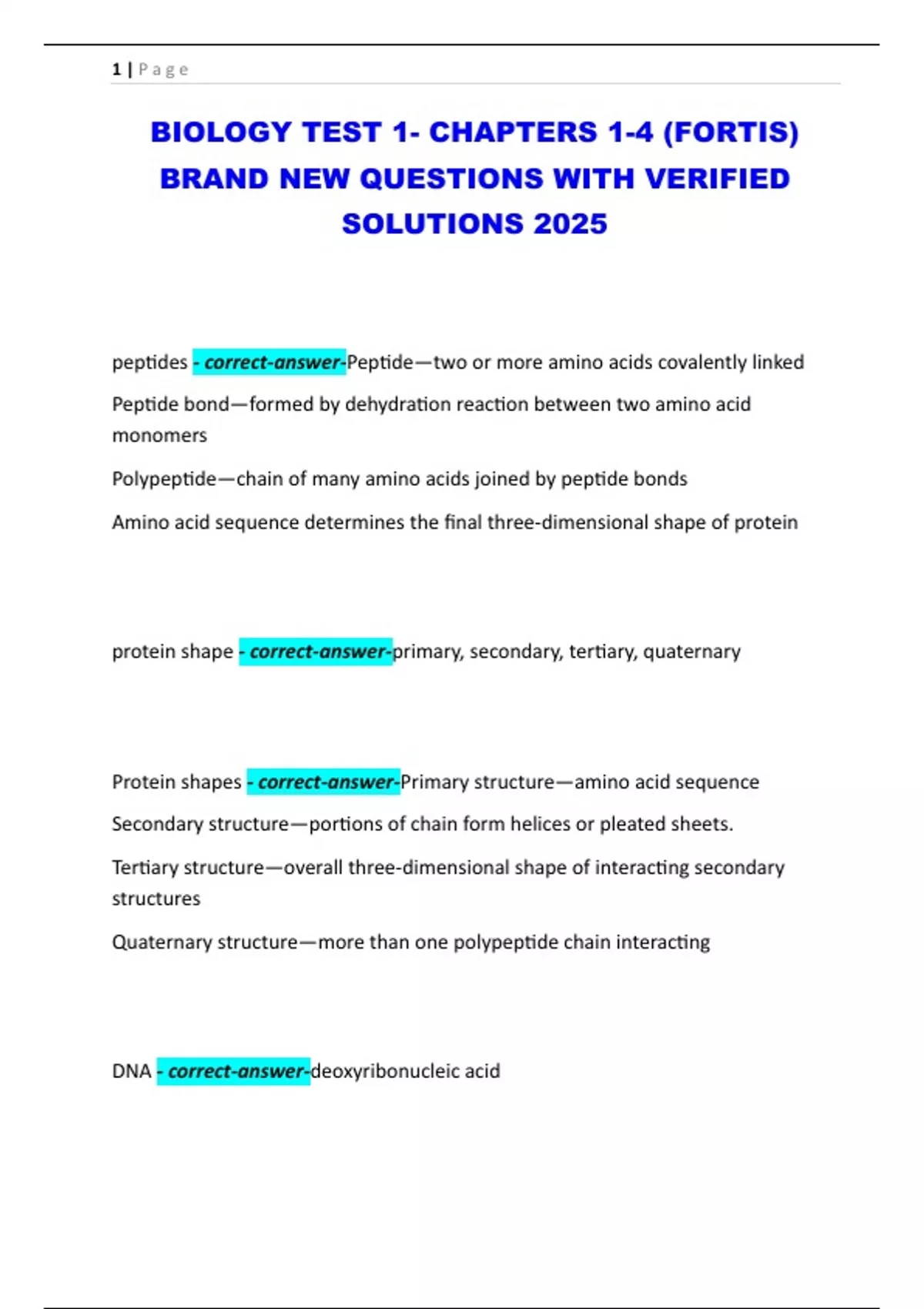 BIOLOGY TEST 1- CHAPTERS 1-4 (FORTIS) BRAND NEW QUESTIONS WITH VERIFIED SOLUTIONS 2025