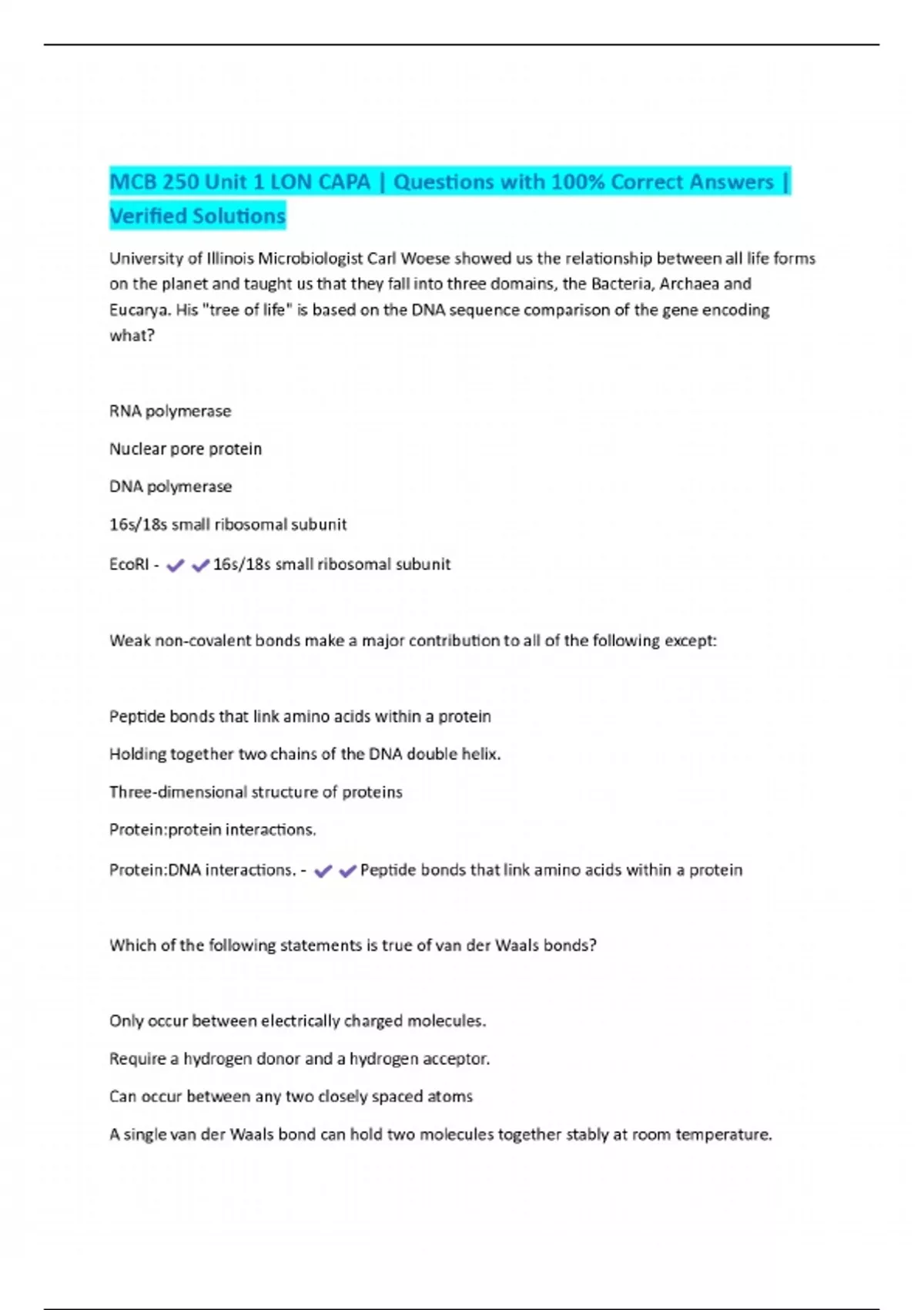 MCB 250 Unit 1 LON CAPA | Questions with 100% Correct Answers | Verified Solutions