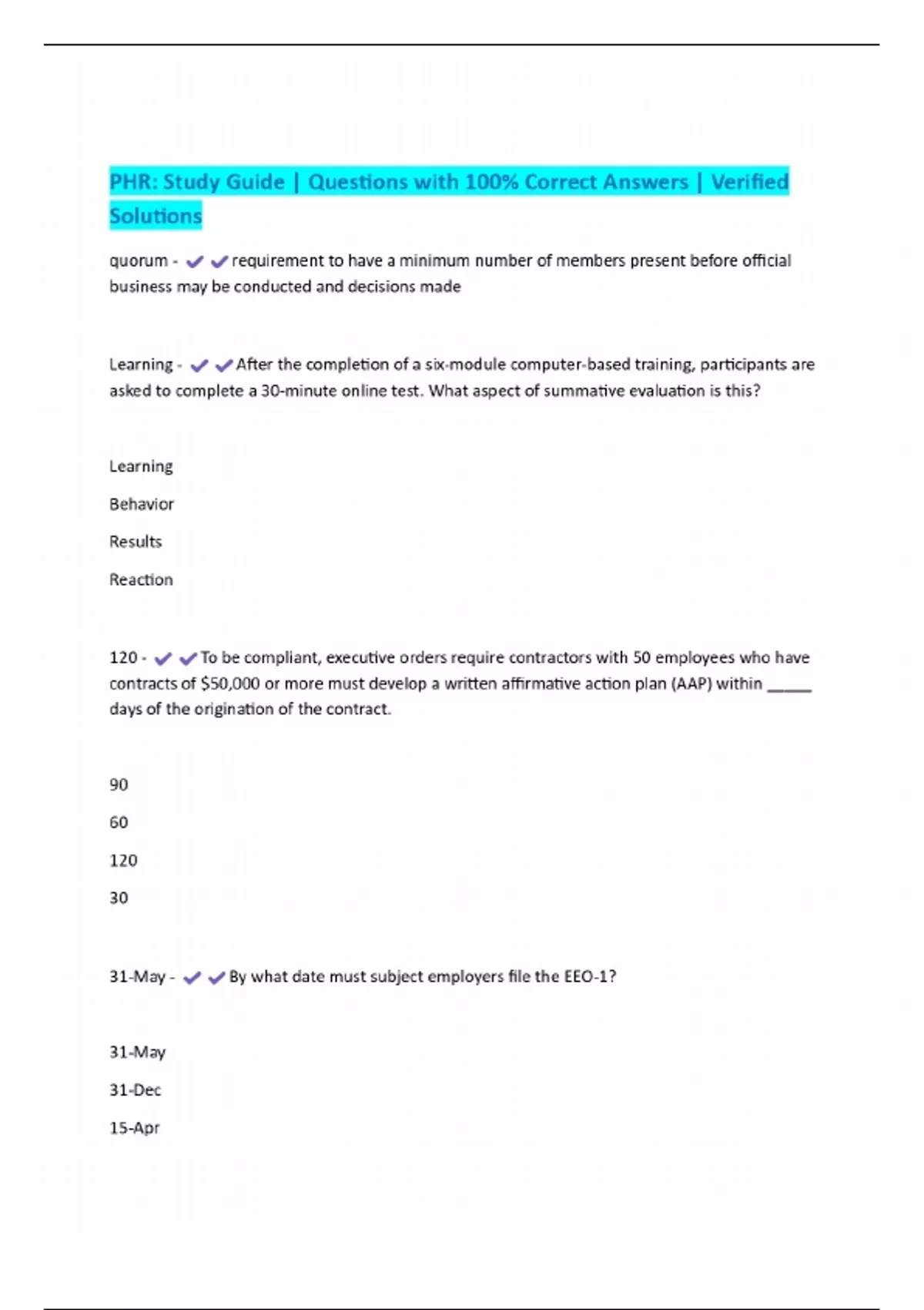 PHR: Study Guide | Questions with 100% Correct Answers | Verified Solutions