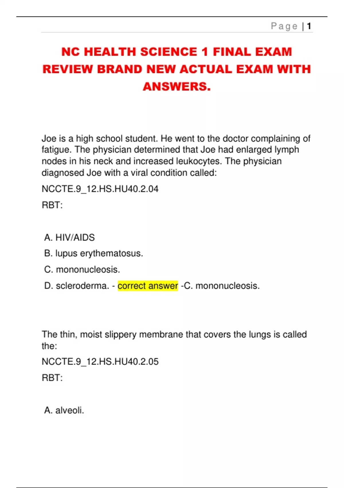 NC HEALTH SCIENCE 1 FINAL EXAM
