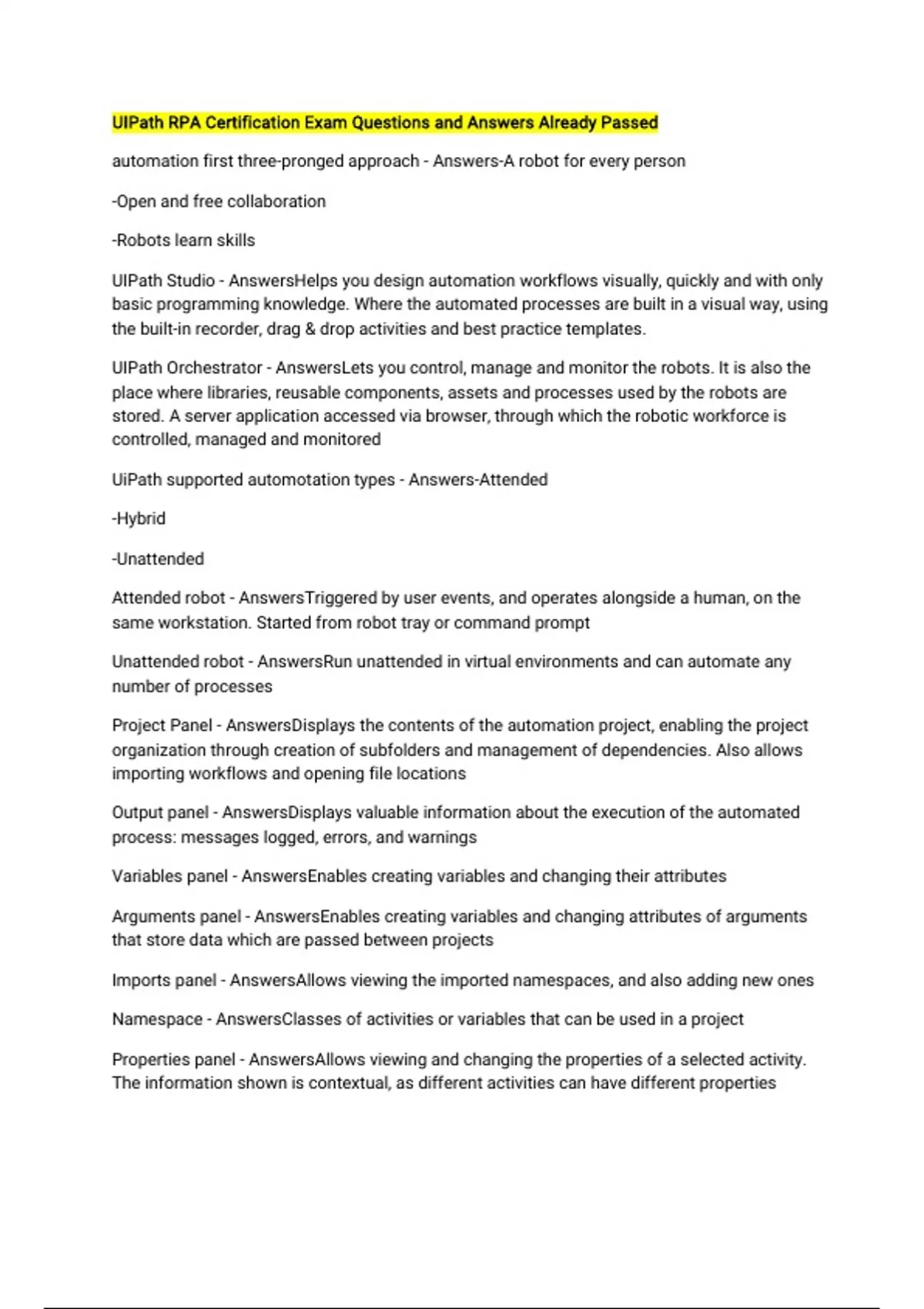 UIPath RPA Certification Exam Questions and Answers Already Passed automation first three-pronged approach - Answers-A robot for every person -Open and free collaboration -Robots learn skills UIPath Studio - AnswersHelps you design automation workflows visually, quickly and with only basic programming knowledge. Where the automated processes are built in a visual way, using the built-in recorder, drag & drop activities and best practice templates. UIPath Orchestrator - AnswersLets you control, manage and monitor the robots. It is also the place where libraries, reusable components, assets and processes used by the robots are stored. A server application accessed via browser, through which the robotic workforce is controlled, managed and monitored UiPath supported automotation types - Answers-Attended -Hybrid -Unattended Attended robot - AnswersTriggered by user events, and operates alongside a human, on the same workstation. Started from robot tray or command prompt Unattended robot - AnswersRun unattended in virtual environments and can automate any number of processes Project Panel - AnswersDisplays the contents of the automation project, enabling the project organization through creation of subfolders and management of dependencies. Also allows importing workflows and opening file locations Output panel - AnswersDisplays valuable information about the execution of the automated process: messages logged, errors, and warnings Variables panel - AnswersEnables creating variables and changing their attributes Arguments panel - AnswersEnables creating variables and changing attributes of arguments that store data which are passed between projects Imports panel - AnswersAllows viewing the imported namespaces, and also adding new ones Namespace - AnswersClasses of activities or variables that can be used in a project Properties panel - AnswersAllows viewing and changing the properties of a selected activity. The information shown is contextual, as different activities can have different properties Outline panel - AnswersDisplays the project hierarchy, all available variables and nodes. You can go to a specific activity by selecting it Process - AnswersA set of interrelated or interacting activites that transform inputs into outputs. Components of a process - Answers-Inputs -Process Flows -Source applications -Outputs