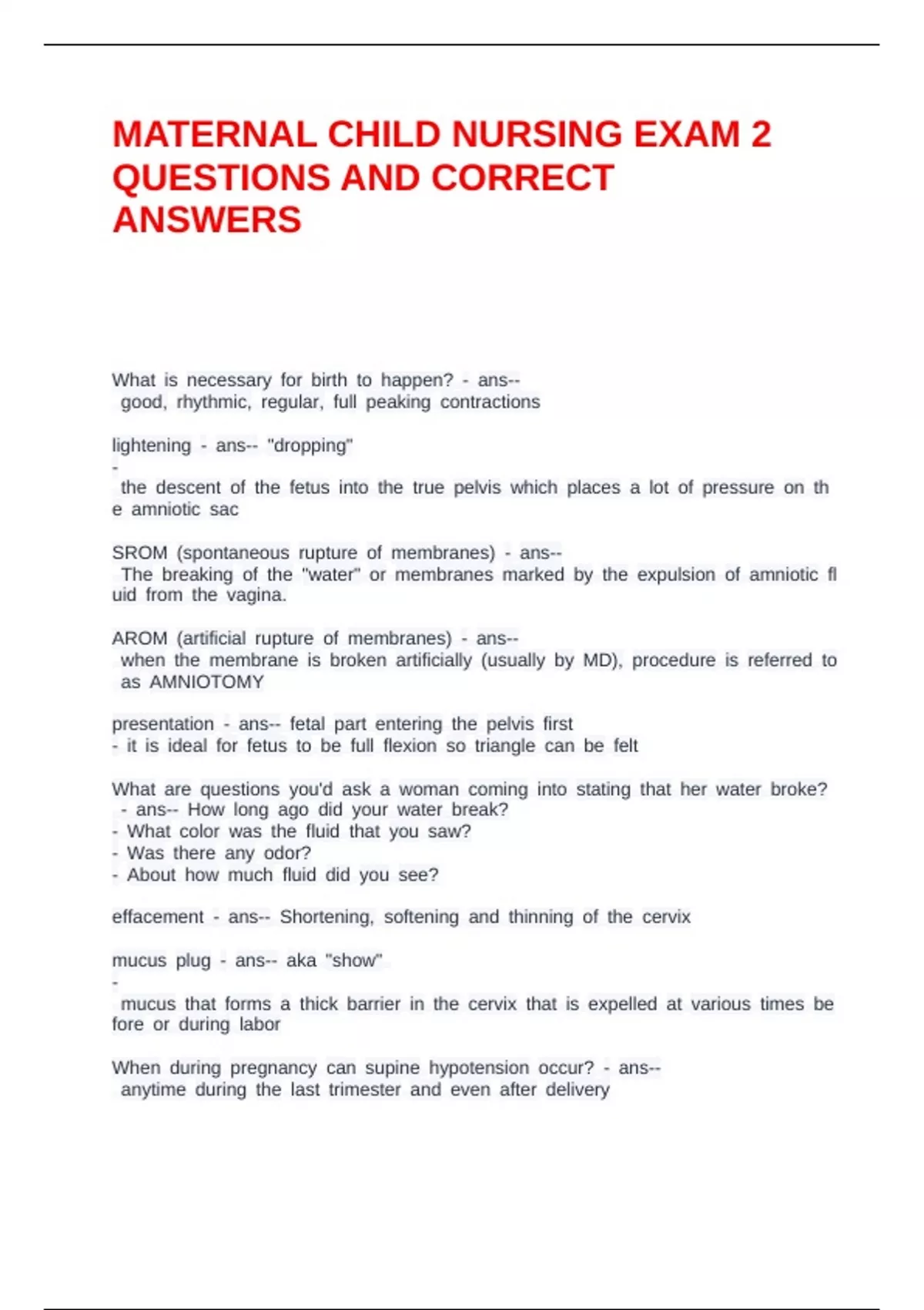 MATERNAL CHILD NURSING EXAM 2 QUESTIONS AND CORRECT ANSWERS