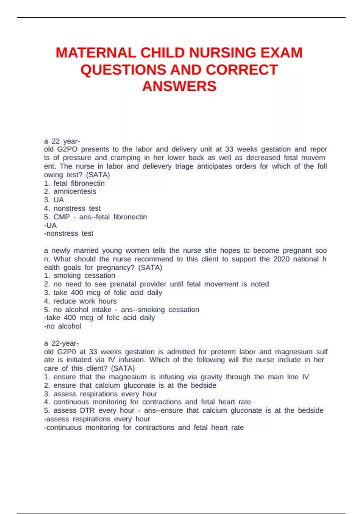 MATERNAL CHILD NURSING EXAM QUESTIONS AND CORRECT ANSWERS