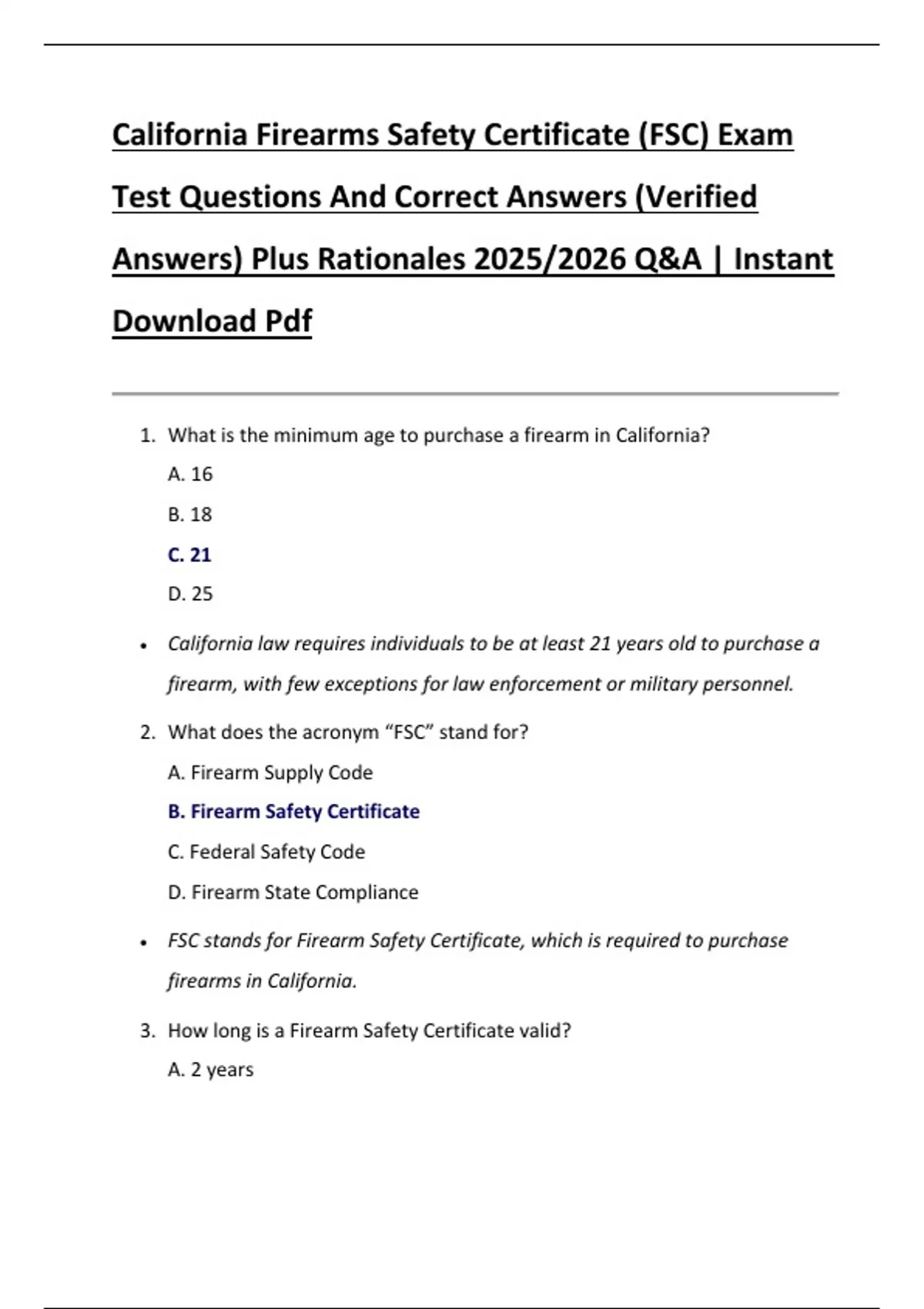 California Firearms Safety Certificate (FSC) Exam Test Questions And Correct Answers (Verified Answers) Plus Rationales 2025/2026 Q&A | Instant Download Pdf