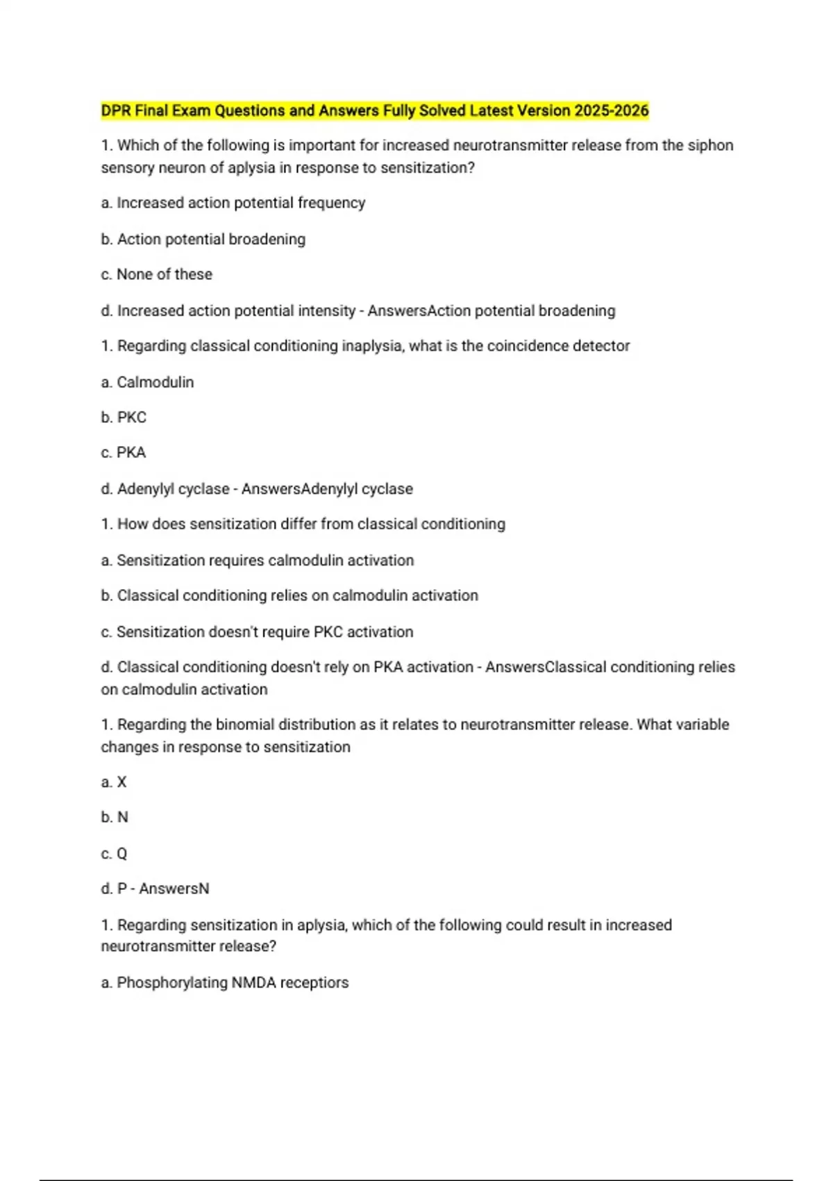 DPR Final Exam Questions and Answers Fully Solved Latest Version 1. Which of the following is important for increased neurotransmitter release from the siphon sensory neuron of aplysia in response to sensitization? a. Increased action potential frequency b. Action potential broadening c. None of these d. Increased action potential intensity - AnswersAction potential broadening 1. Regarding classical conditioning inaplysia, what is the coincidence detector a. Calmodulin b. PKC c. PKA d. Adenylyl cyclase - AnswersAdenylyl cyclase 1. How does sensitization differ from classical conditioning a. Sensitization requires calmodulin activation b. Classical conditioning relies on calmodulin activation c. Sensitization doesn't require PKC activation d. Classical conditioning doesn't rely on PKA activation - AnswersClassical conditioning relies on calmodulin activation 1. Regarding the binomial distribution as it relates to neurotransmitter release. What variable changes in response to sensitization a. X b. N c. Q d. P - AnswersN 1. Regarding sensitization in aplysia, which of the following could result in increased neurotransmitter release? a. Phosphorylating NMDA receptiors b. Phosphorylating AMPA receptors c. Phosphorylating sodium channels d. Phosphorylating potassium channels - AnswersPhosphorylating potassium channels 1. The Gs and Gq/11 pathways cause what changes to the post synaptic cell a. Decreased neurotransmitter release b. Siphon withdrawal c. No change