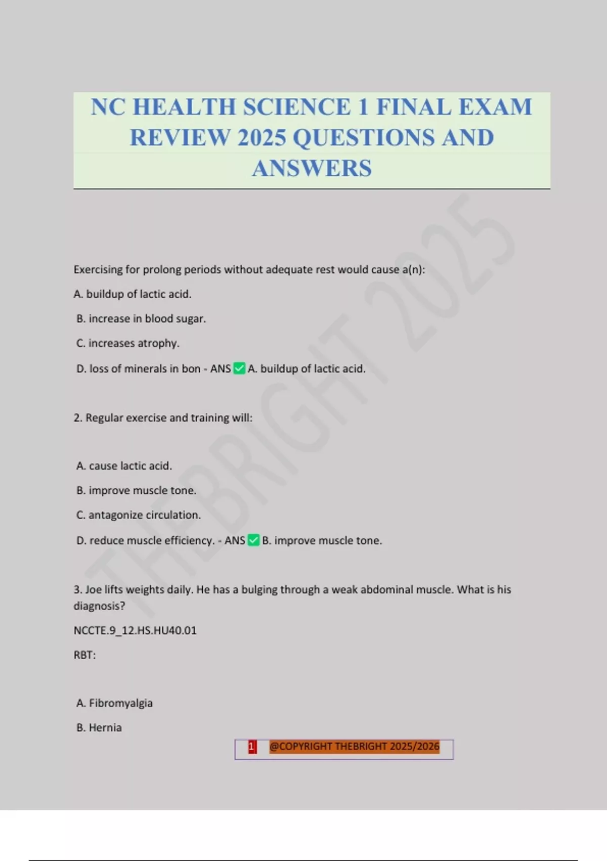 Exercising for prolong periods without adequate rest would cause a(n): A. buildup of lactic acid. B. increase in blood sugar. C. increases atrophy. D. loss of minerals in bon - ANS A. buildup of lactic acid. 2. Regular exercise and training will: A. cause lactic acid. B. improve muscle tone. C. antagonize circulation. D. reduce muscle efficiency. - ANS B. improve muscle tone. 3. Joe lifts weights daily. He has a bulging through a weak abdominal muscle. What is his diagnosis? NCCTE.9_12.HS.HU40.01 RBT: A. Fibromyalgia B. Hernia NC HEALTH SCIENCE 1 FINAL EXAM REVIEW 2025 QUESTIONS AND ANSWERS 2 @COPYRIGHT THEBRIGHT 2025/2026 C. Muscular Dystrophy D. Tendonitis - ANS B. Hernia 4. When Joe flexes his bicep, what characteristic of muscles describes what is happening to his bicep? NCCTE.9_12.HS.HU40.01 RBT: A. Contractibility B. Elasticity C. Excitability D. Extensibility - ANS A. Contractibility 5. Cory stretches every night after running. What is his desired outcome? NCCTE.9_12.HS.HU40.01 RBT: A. Atrophy B. Contractibility C. Extensibility D. Hypertrophy - ANS C. Extensibility 6. Eating a diet high in calcium will improve the health of your bones, teeth, and nervous system as well as: NCCTE.9_12.HS.HU40.02 RBT: A. aid in blood clotting. 3 @COPYRIGHT THEBRIGHT 2025/2026 B. heal damaged tissue. C. produce energy. D. promote growth. - ANS A. aid in blood clotting. 7. Weston presented in the emergency department with abdominal pain and nausea after eating a meal that was high in fat. His symptoms indicate a diagnosis of: NCCTE.9_12.HS.HU40.02 RBT: A. cholelithiasis. B. gastroenteritis. C. gastroesophageal reflux. D. hepatitis C. - ANS A. cholelithiasis. 8. Ashely experienced pain and burning in the epigastric region when she lays flat in bed. This condition improves when she raises the head of her bed. She has: NCCTE.9_12.HS.HU40.02 RBT: A. cholelithiasis. B. gastroenteritis. C. gastroesophageal reflux. D. hepatitis B. - ANS C. gastroesophage