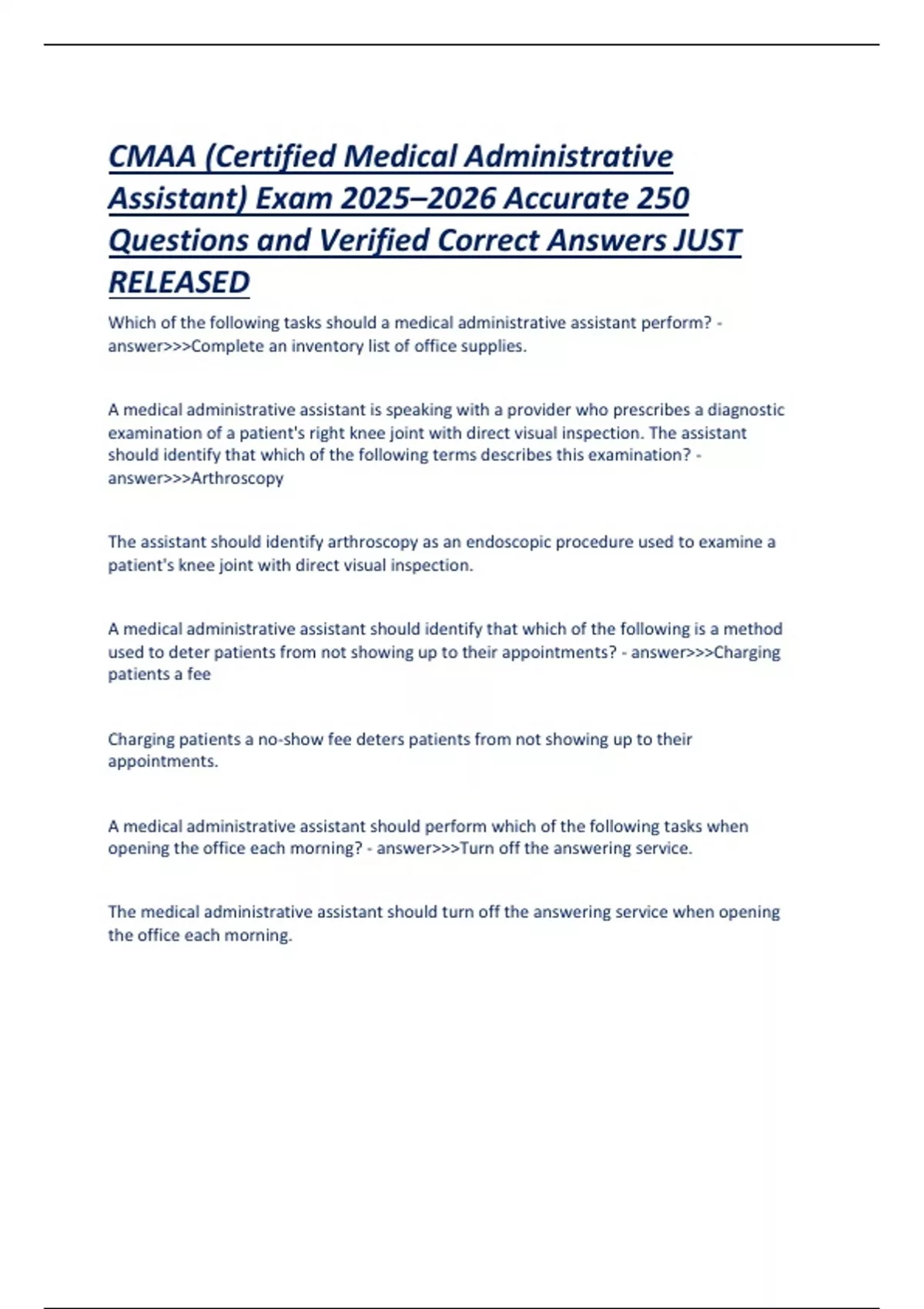 This document contains 250 up-to-date practice questions for the Certified Medical Administrative Assistant (CMAA) exam, each accompanied by the verified correct answer. The material is aligned with the 2025–2026 CMAA exam format and covers key areas such as medical office procedures, patient scheduling, billing and insurance, medical law, and record management. It serves as a complete preparation resource for candidates seeking to pass the CMAA certification on the first attempt.