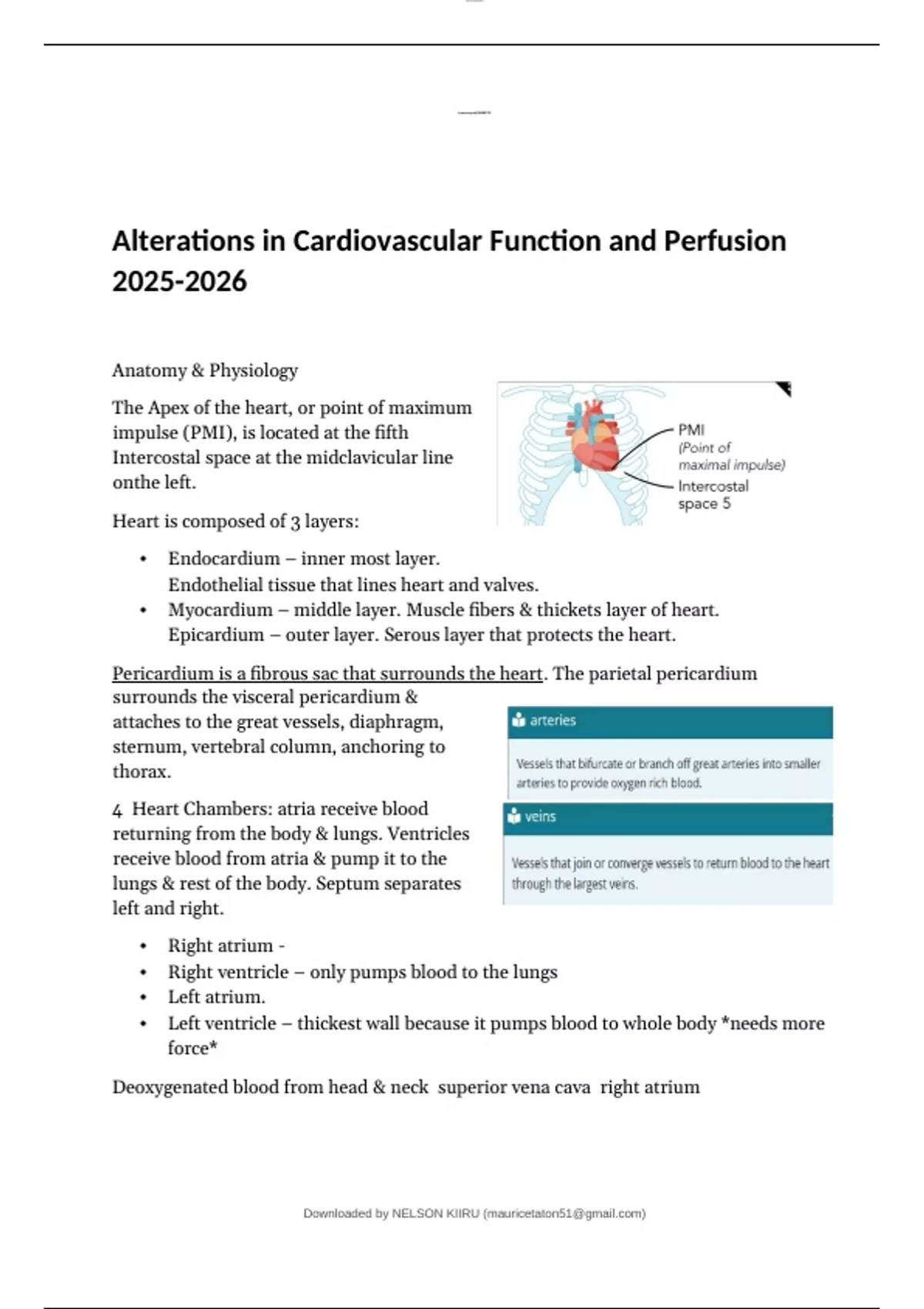 Anatomy & Physiology The Apex of the heart, or point of maximum impulse (PMI), is located at the fifth Intercostal space at the midclavicular line onthe left. Heart is composed of 3 layers: • Endocardium – inner most layer. Endothelial tissue that lines heart and valves. • Myocardium – middle layer. Muscle fibers & thickets layer of heart. • Epicardium – outer layer. Serous layer that protects the heart.Alterations in Cardiovascular Function and Perfusion