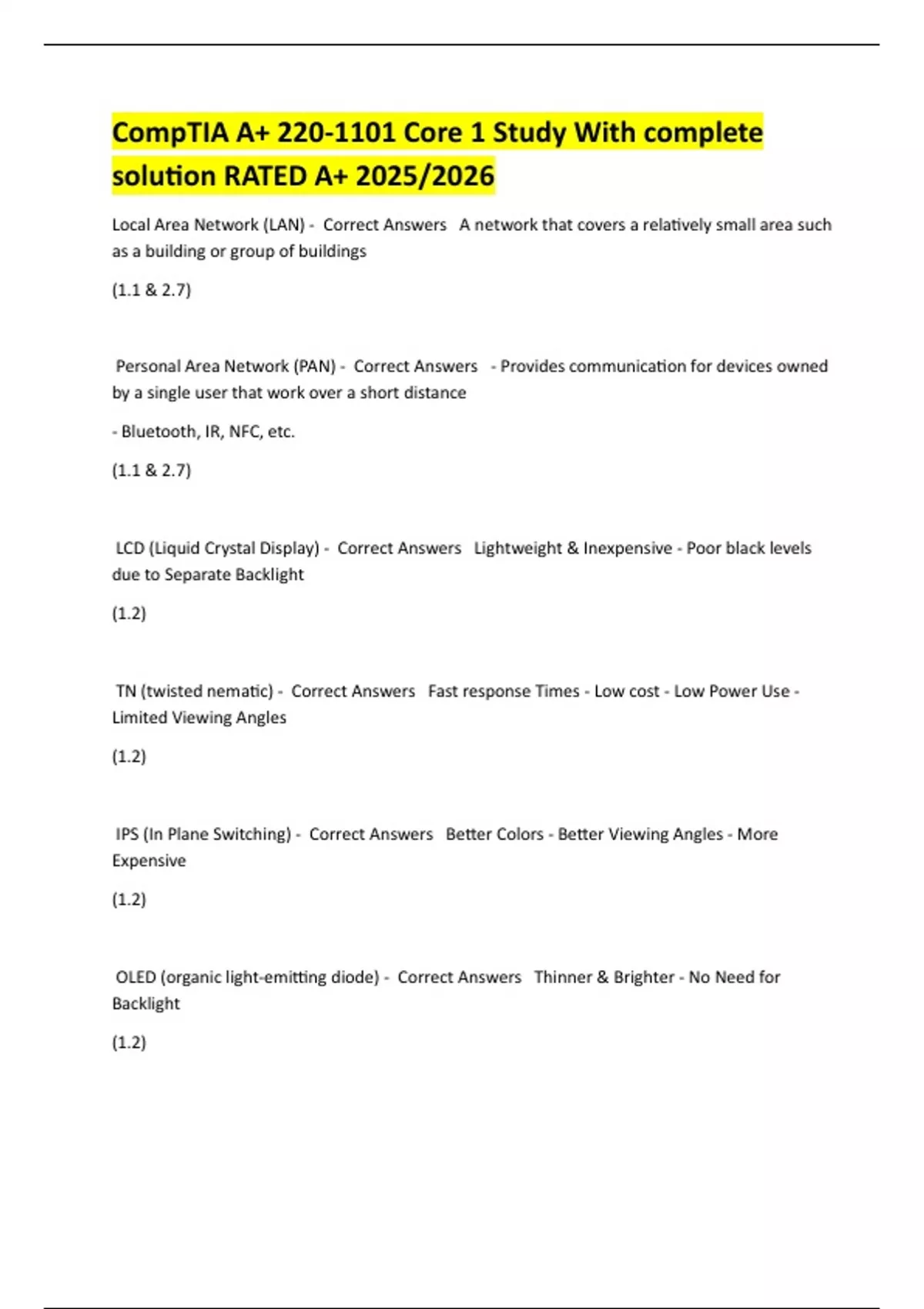 LCD (Liquid Crystal Display) - Correct Answers Lightweight & Inexpensive - Poor black levels