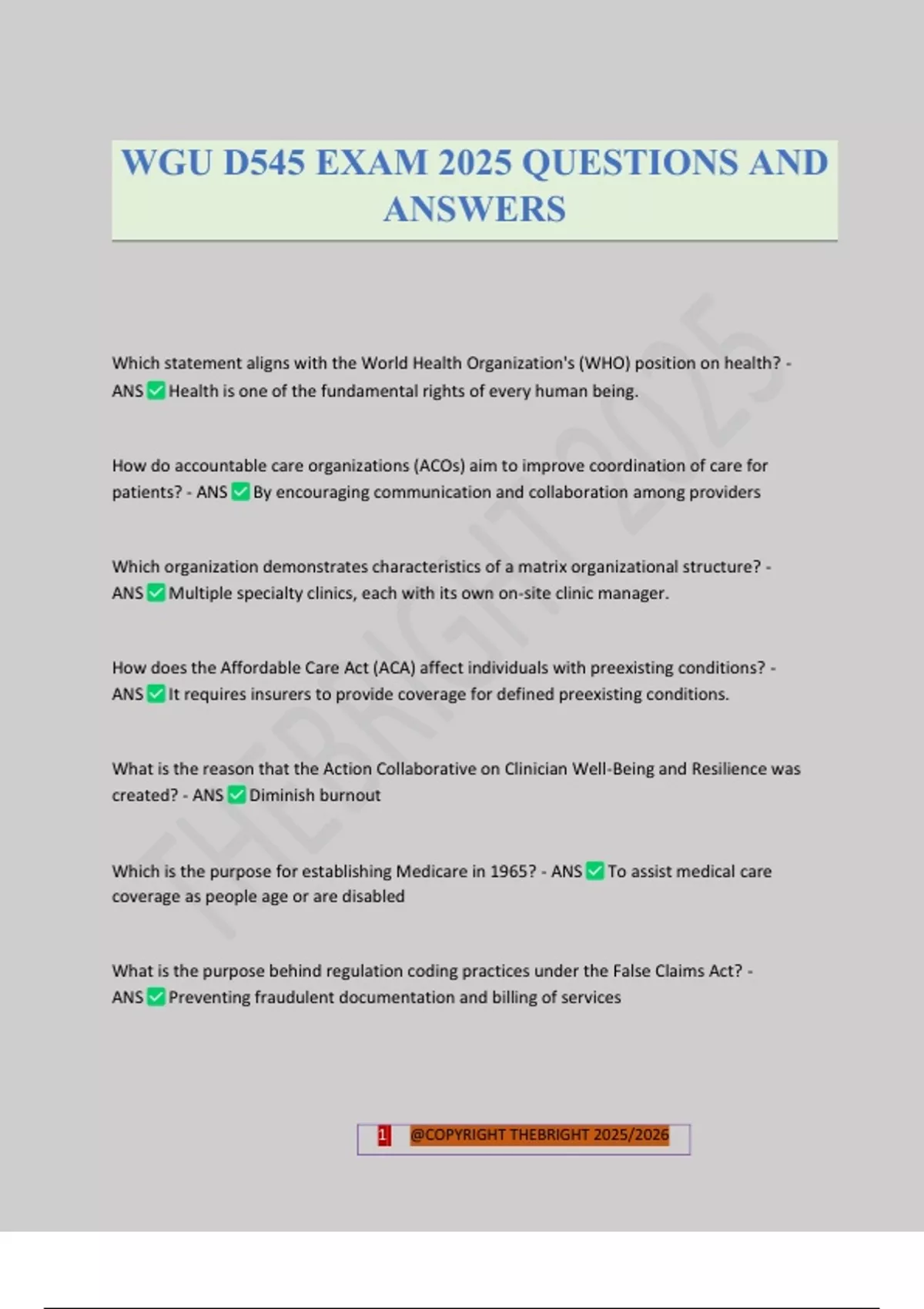 Which statement aligns with the World Health Organization's (WHO) position on health? - ANS Health is one of the fundamental rights of every human being. How do accountable care organizations (ACOs) aim to improve coordination of care for patients? - ANS By encouraging communication and collaboration among providers Which organization demonstrates characteristics of a matrix organizational structure? - ANS Multiple specialty clinics, each with its own on-site clinic manager. How does the Affordable Care Act (ACA) affect individuals with preexisting conditions? - ANS It requires insurers to provide coverage for defined preexisting conditions. What is the reason that the Action Collaborative on Clinician Well-Being and Resilience was created? - ANS Diminish burnout Which is the purpose for establishing Medicare in 1965? - ANS To assist medical care coverage as people age or are disabled What is the purpose behind regulation coding practices under the False Claims Act? - ANS Preventing fraudulent documentation and billing of services WGU D545 EXAM 2025 QUESTIONS AND ANSWERS 2 @COPYRIGHT THEBRIGHT 2025/2026 What was the relationship between changing demographics in the US and the Medicare Monetization Act (MMA) of 2003? - ANS An aging population led to increased prescription coverage under the MMA. How does telehealth impact clinician collaboration? - ANS Clinicians use telehealth to speak and videoconference with one another remotely. A doctor needs assistance in making a diagnosis based on patient symptoms and medical history. Which technology tool should the doctor use to get recommendations and guidelines for making a diagnosis? - ANS Clinical decision support system (CDSS) How can a clinician apply the laboratory information system (LIS) to improve patient communication? - ANS By making laboratory results accessible through a patient's electronic health record A hospital manager is analyzing literature to understand how clinicians have responded to regulatory changes in other healthcare organizations' hospitals. Why is the manager studying this literature when utilizing organizational model analysis? - ANS To predict future behavior What is the role of an analyst in the synoptic model within the rational model of healthcare analysis? - ANS To supply quality information to decision-makers After successfully implementing