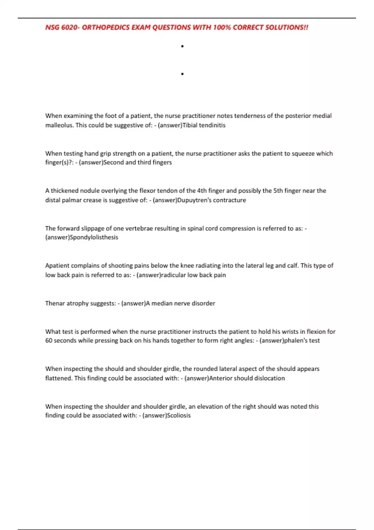 NSG 6020- ORTHOPEDICS EXAM QUESTIONS WITH 100% CORRECT SOLUTIONS!!