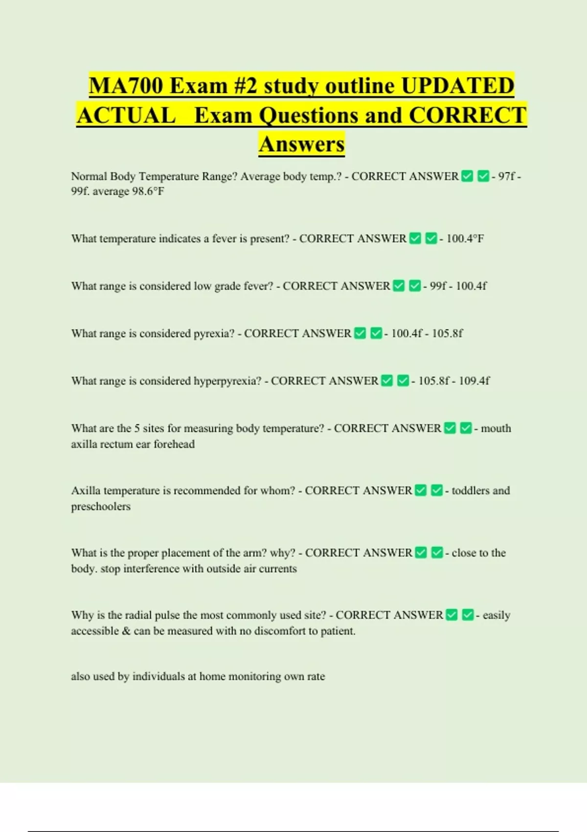 MA700 Exam #2 study outline UPDATED ACTUAL Exam Questions and CORRECT Answers Normal Body Temperature Range? Average body temp.? - CORRECT ANSWER 99f. average 98.6°F What temperature indicates a fever is present? - CORRECT ANSWER What range is considered low grade fever? - CORRECT ANSWER What range is considered pyrexia? - CORRECT ANSWER What range is considered hyperpyrexia? - CORRECT ANSWER What are the 5 sites for measuring body temperature? - CORRECT ANSWER axilla rectum ear forehead Axilla temperature is recommended for whom? - CORRECT ANSWER preschoolers What is the proper placement of the arm? why? - CORRECT ANSWER body. stop interference with outside air currents Why is the radial pulse the most commonly used site? - CORRECT ANSWER accessible & can be measured with no discomfort to patient. also used by individuals at home monitoring own rate - 97f - - 100.4°F - 99f - 100.4f - 100.4f - 105.8f