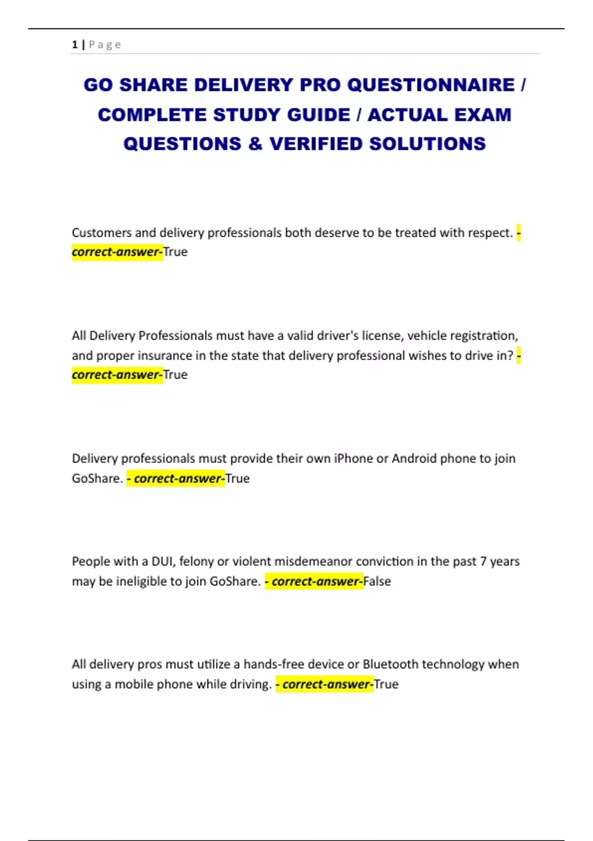 GO SHARE DELIVERY PRO QUESTIONNAIRE / COMPLETE STUDY GUIDE / ACTUAL EXAM QUESTIONS & VERIFIED SOLUTIONS