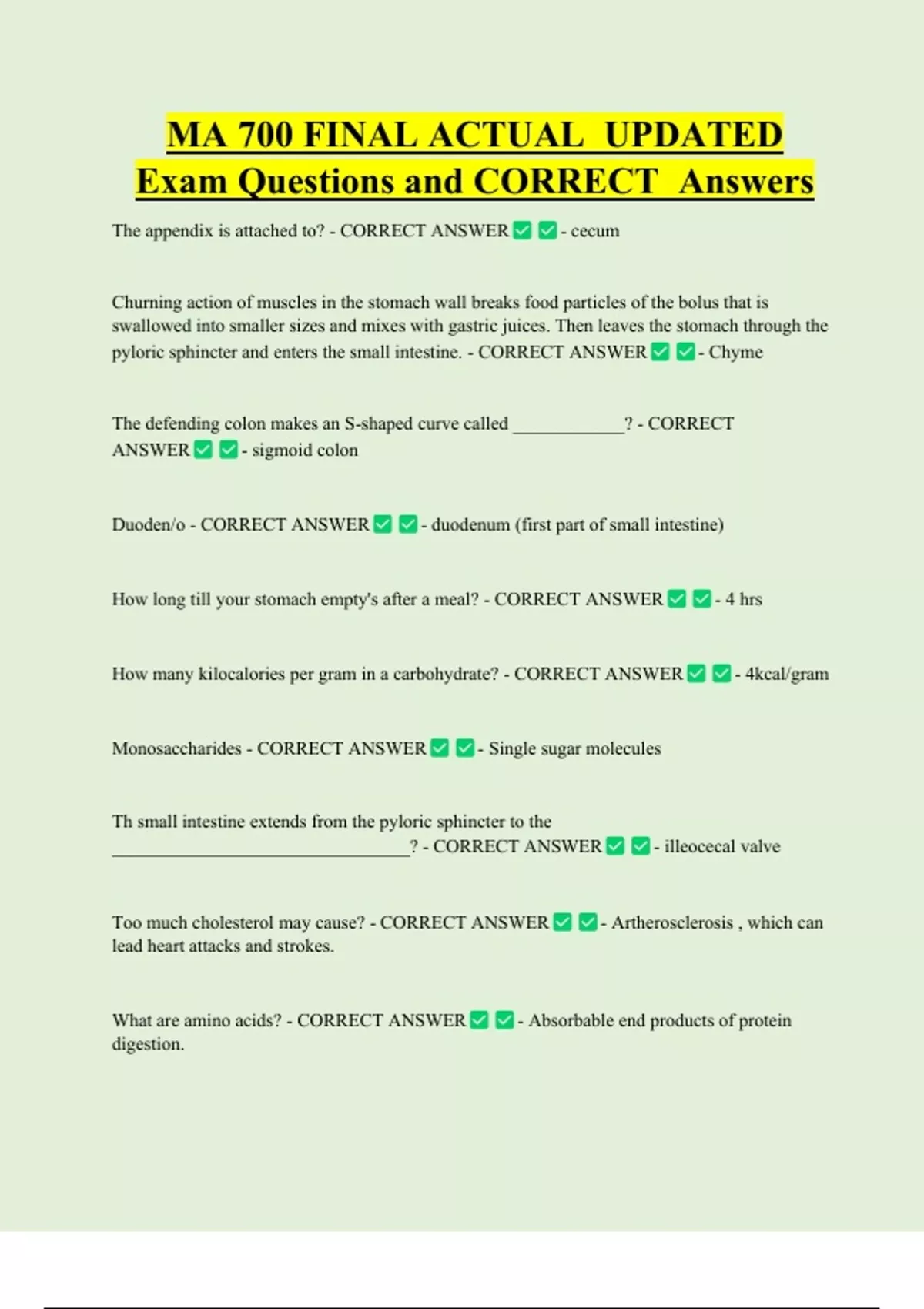 MA 700 FINAL ACTUAL UPDATED Exam Questions and CORRECT Answers The appendix is attached to? - CORRECT ANSWER - cecum Churning action of muscles in the stomach wall breaks food particles of the bolus that is swallowed into smaller sizes and mixes with gastric juices. Then leaves the stomach through the pyloric sphincter and enters the small intestine. - CORRECT ANSWER - Chyme The defending colon makes an S-shaped curve called ____________? - CORRECT ANSWER - sigmoid colon