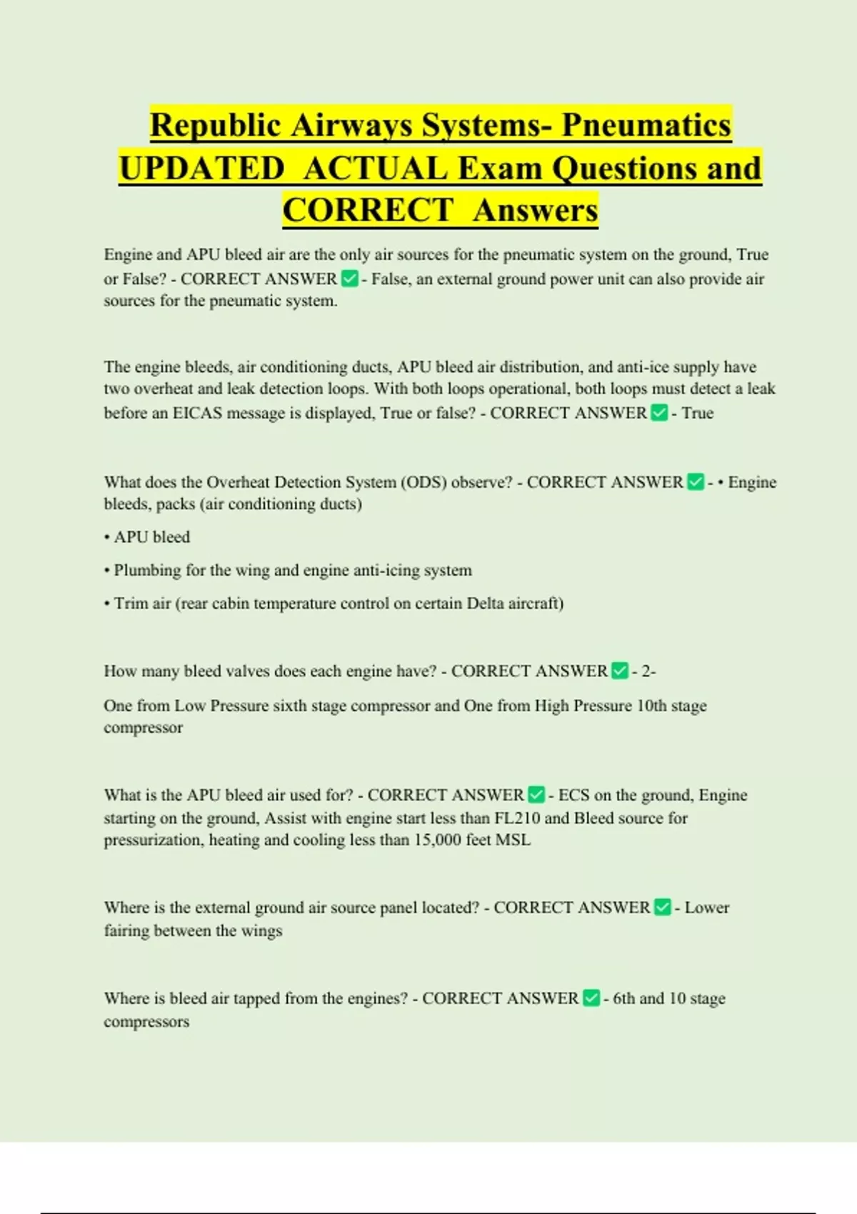 Republic Airways Systems- Pneumatics UPDATED ACTUAL Exam Questions and CORRECT Answers Engine and APU bleed air are the only air sources for the pneumatic system on the ground, True or False? - CORRECT ANSWER - False, an external ground power unit can also provide air sources for the pneumatic system. The engine bleeds, air conditioning ducts, APU bleed air distribution, and anti-ice supply have two overheat and leak detection loops. With both loops operational, both loops must detect a leak before an EICAS message is displayed, True or false? - CORRECT ANSWER - True