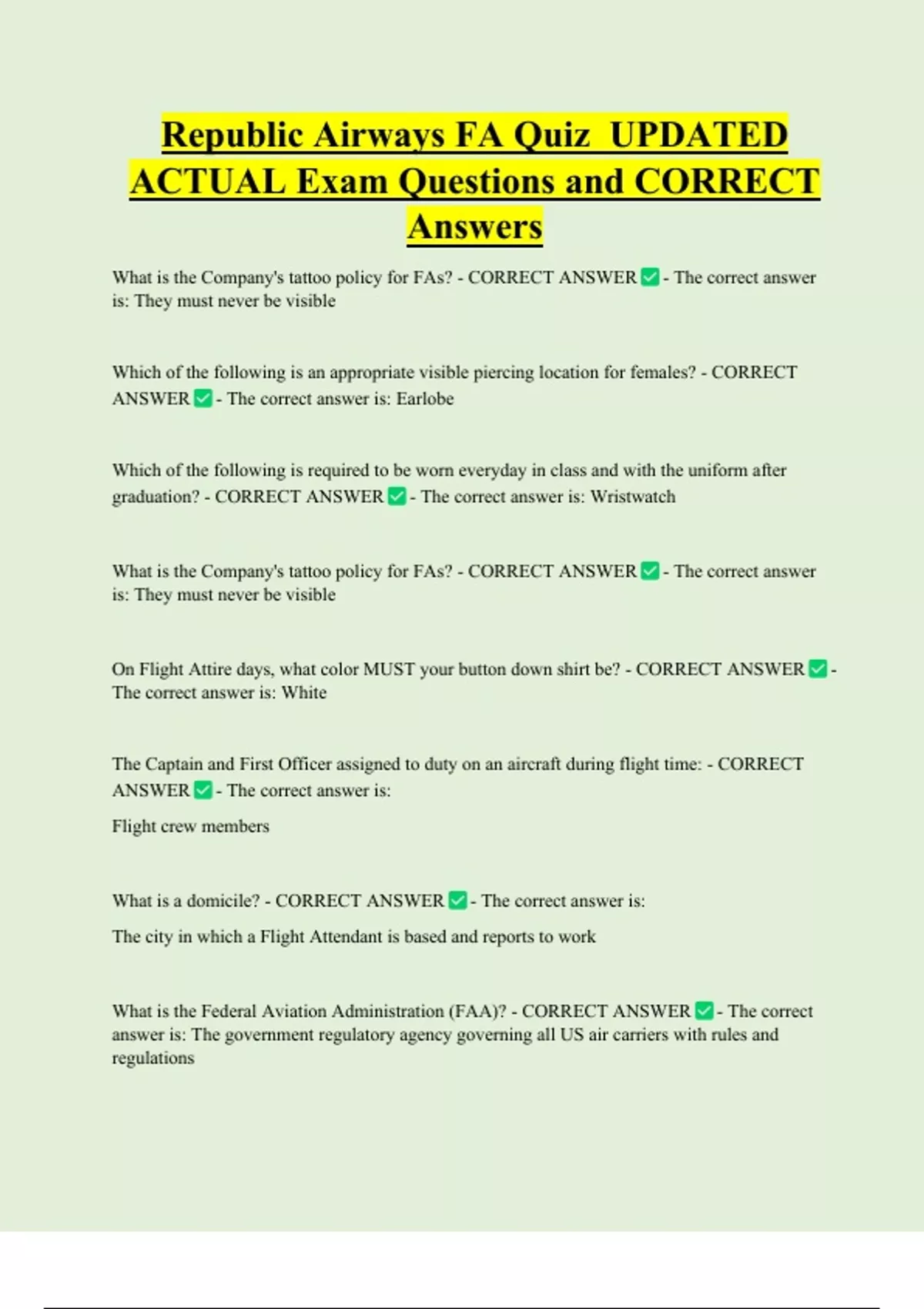 Republic Airways FA Quiz UPDATED ACTUAL Exam Questions and CORRECT Answers What is the Company's tattoo policy for FAs? - CORRECT ANSWER - The correct answer is: They must never be visible Which of the following is an appropriate visible piercing location for females? - CORRECT ANSWER - The correct answer is: Earlobe Which of the following is required to be worn everyday in class and with the uniform after graduation? - CORRECT ANSWER - The correct answer is: Wristwatch
