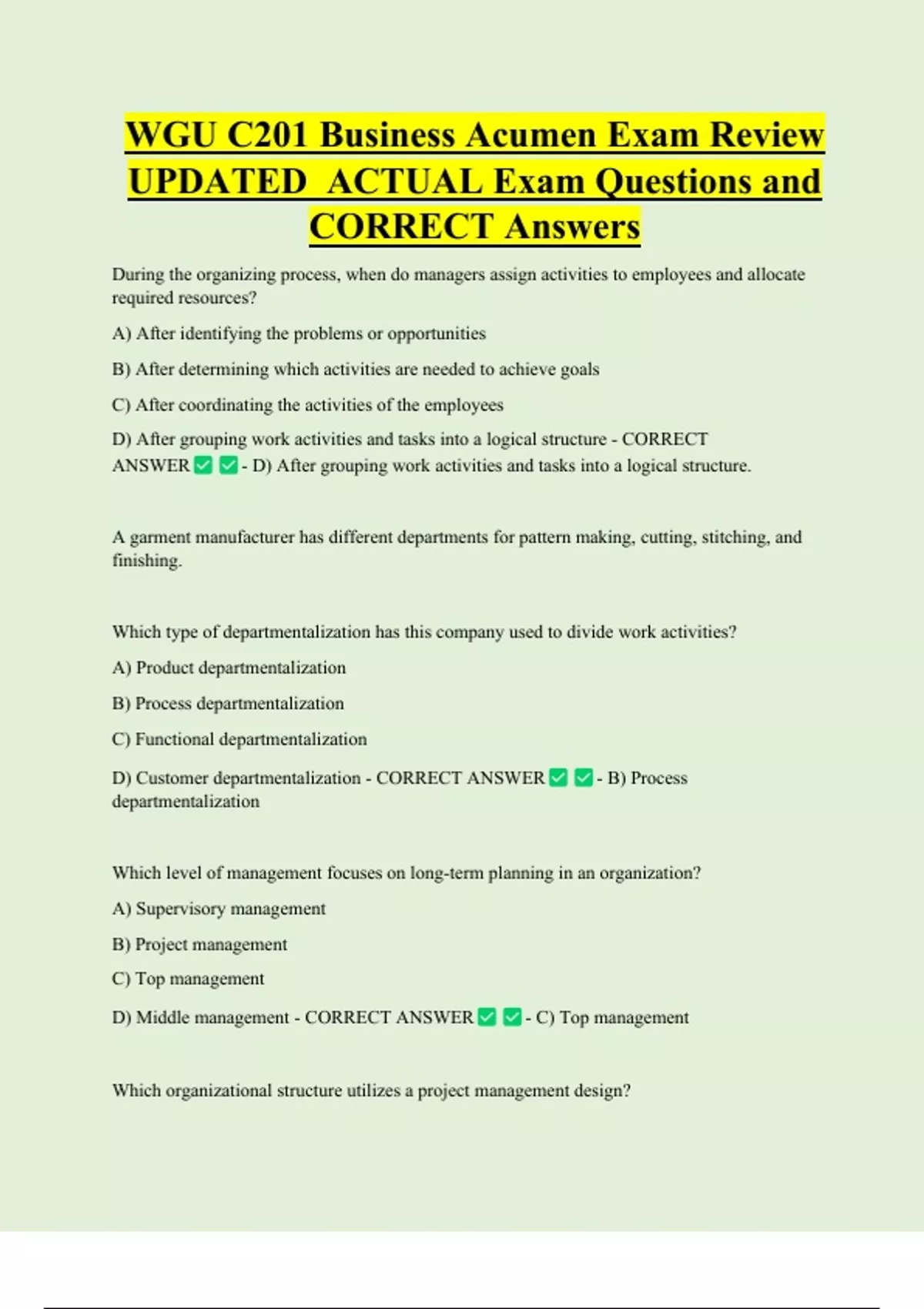 WGU C201 Business Acumen Exam Review UPDATED ACTUAL Exam Questions and CORRECT Answers During the organizing process, when do managers assign activities to employees and allocate required resources? A) After identifying the problems or opportunities B) After determining which activities are needed to achieve goals C) After coordinating the activities of the employees D) After grouping work activities and tasks into a logical structure - CORRECT ANSWER - D) After grouping work activities and tasks into a logical structu