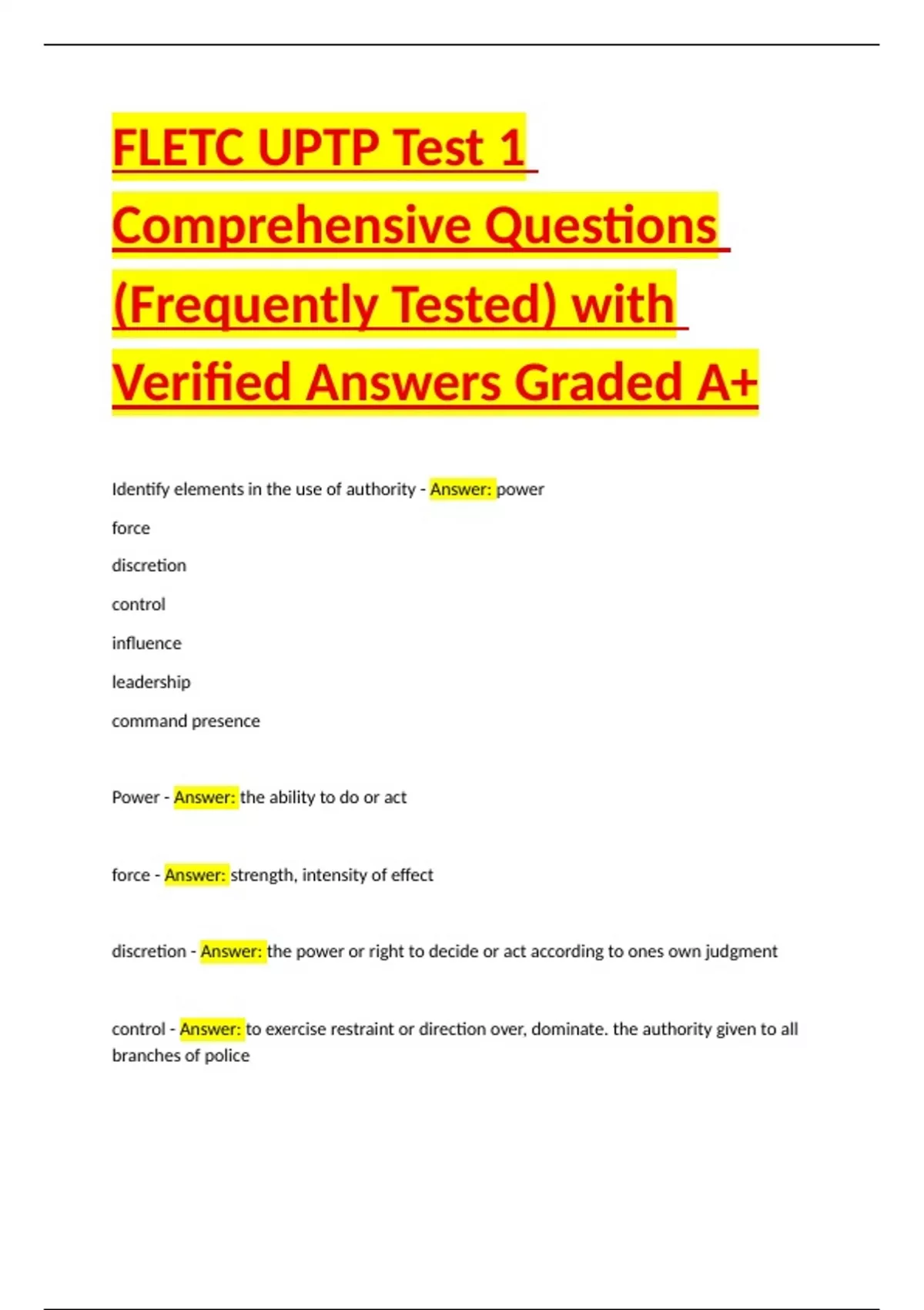 FLETC UPTP Test 1 Comprehensive Questions (Frequently Tested) with Verified Answers Graded A+