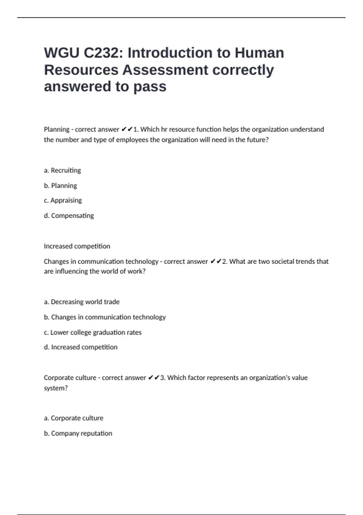 Planning - correct answer ✔✔1. Which hr resource function helps the organization understand