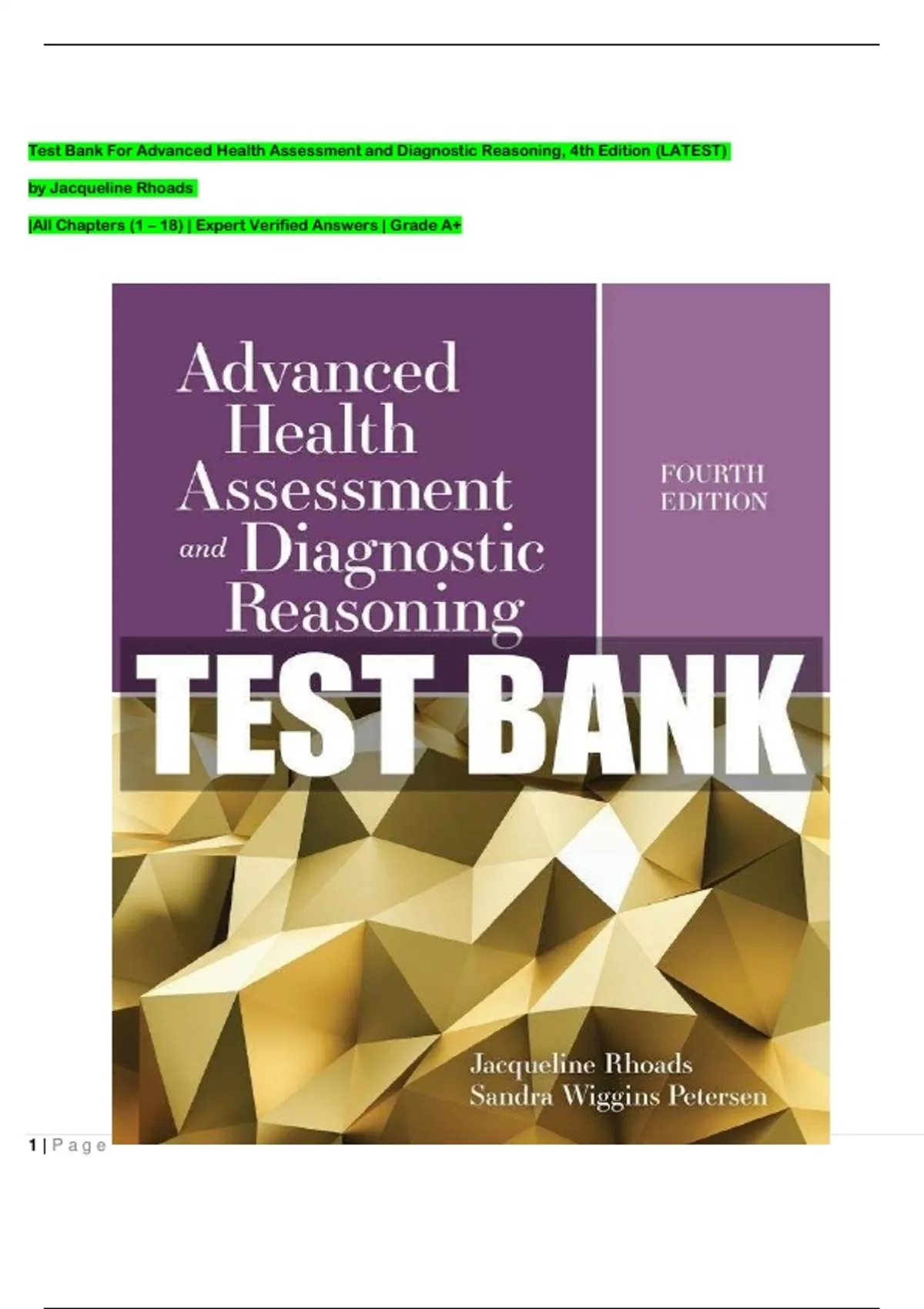 This document contains the complete test bank for Advanced Health Assessment and Diagnostic Reasoning (4th Edition, Jacqueline Rhoads, 2025), covering chapters 1 through 18. It includes a comprehensive set of multiple-choice, true/false, and scenario-based questions with correct answers. Ideal for exam preparation, clinical reasoning practice, and advanced nursing assessment review.
