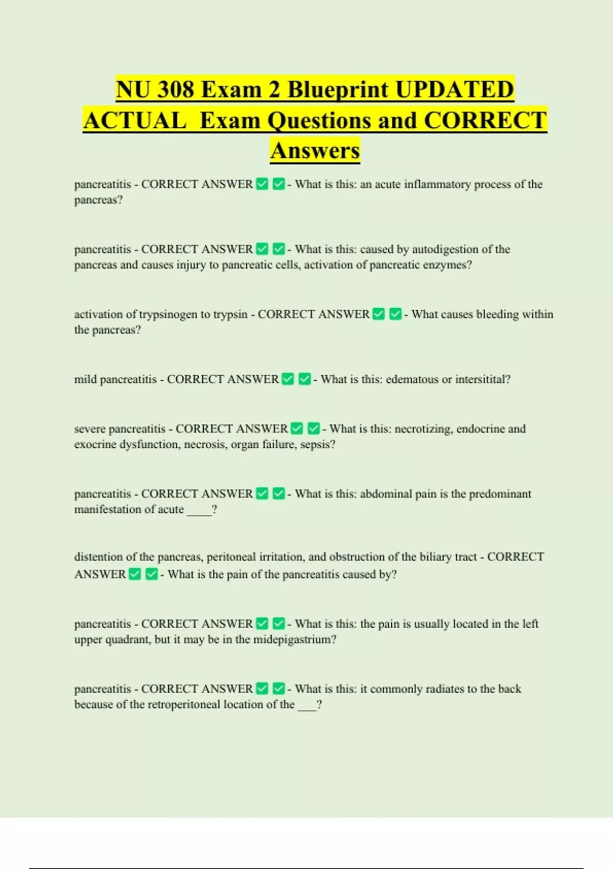 eating - CORRECT ANSWER - What is the pain of the pancreatitis aggravated by?