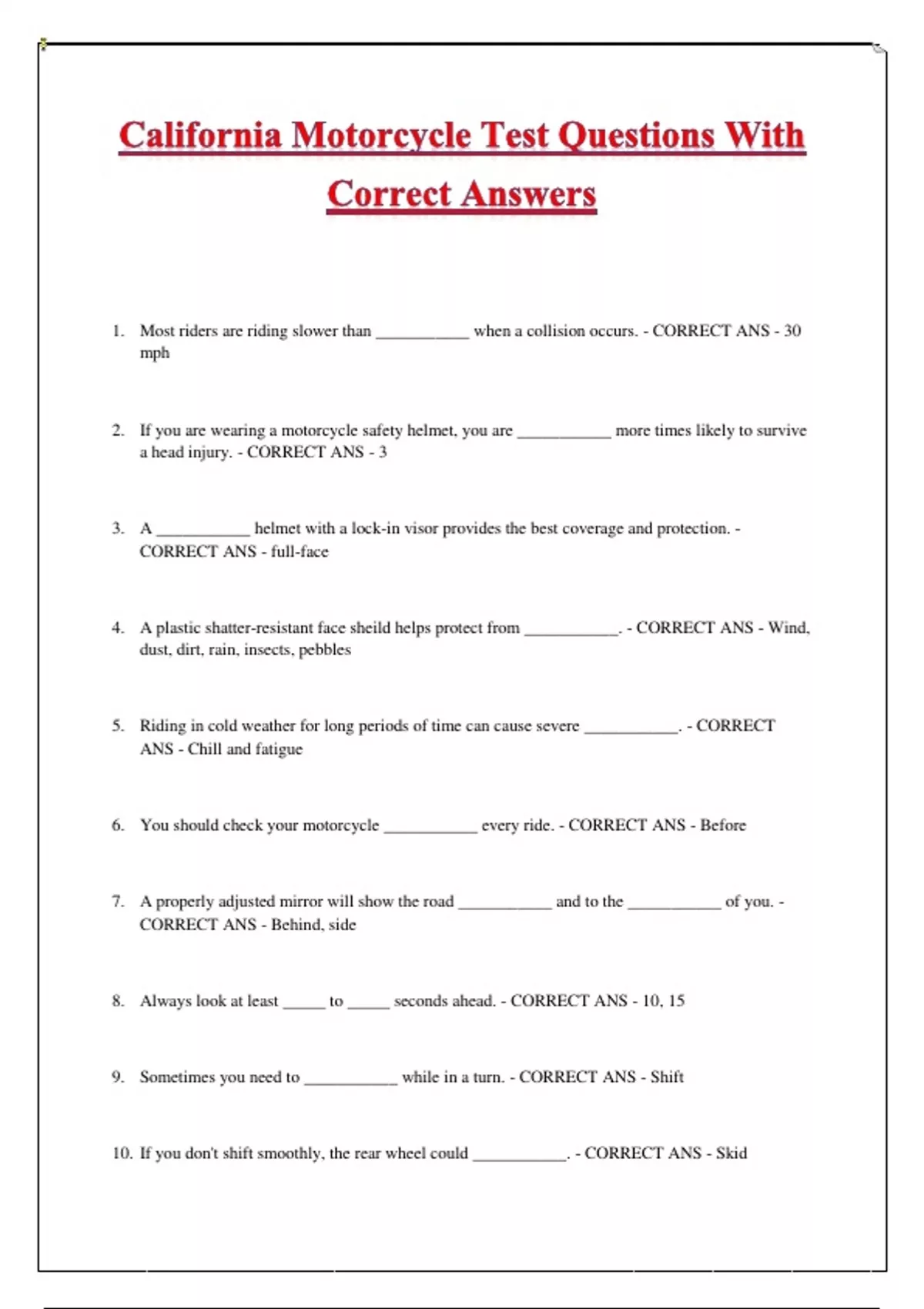 10. If you don't shift smoothly, the rear wheel could ___________. - CORRECT ANS - Skid