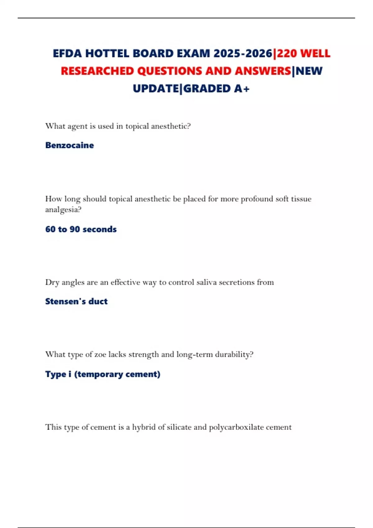EFDA HOTTEL BOARD EXAM |220 WELL RESEARCHED QUESTIONS AND ANSWERS|NEW UPDATE|GRADED A+