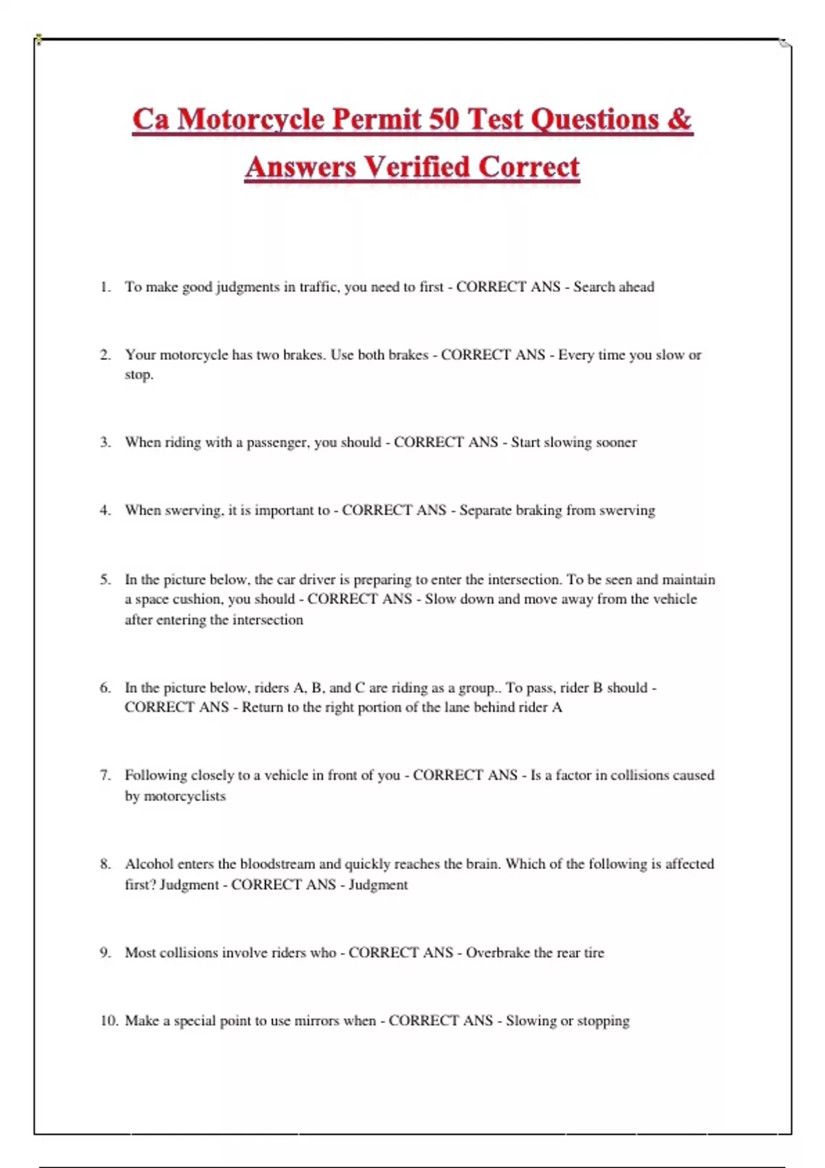 Ca Motorcycle Permit 50 Test Questions & Answers Verified Correct