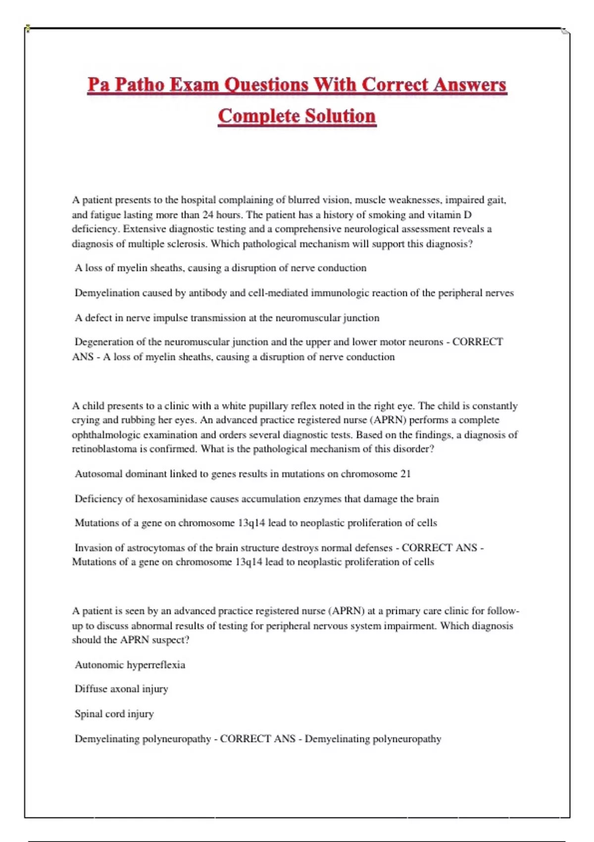 Demyelinating polyneuropathy - CORRECT ANS - Demyelinating polyneuropathy
