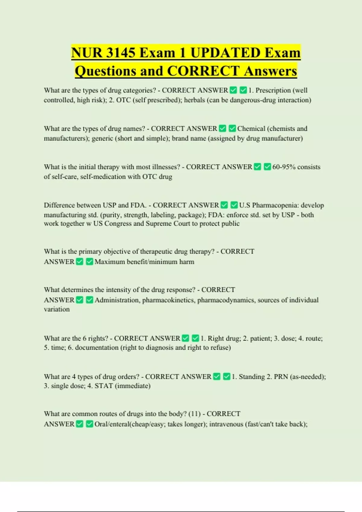 NUR 3145 Exam 1 UPDATED Exam Questions and CORRECT Answers What are the types of drug categories? - CORRECT ANSWER 1. Prescription (well controlled, high risk); 2. OTC (self prescribed); herbals (can be dangerous-drug interaction) What are the types of drug names? - CORRECT ANSWER Chemical (chemists and manufacturers); generic (short and simple); brand name (assigned by drug manufacturer) What is the initial therapy with most illnesses? - CORRECT ANSWER of self-care, self-medication with OTC drug Difference between USP and FDA. - CORRECT ANSWER 60-95% consis