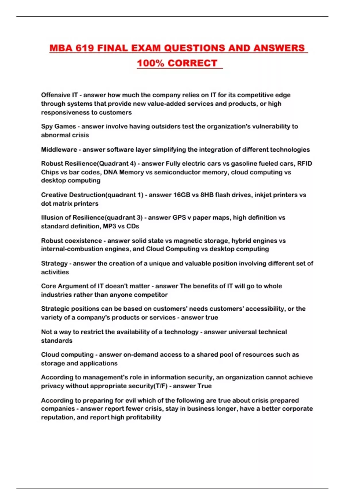 MBA 619 FINAL EXAM QUESTIONS AND ANSWERS