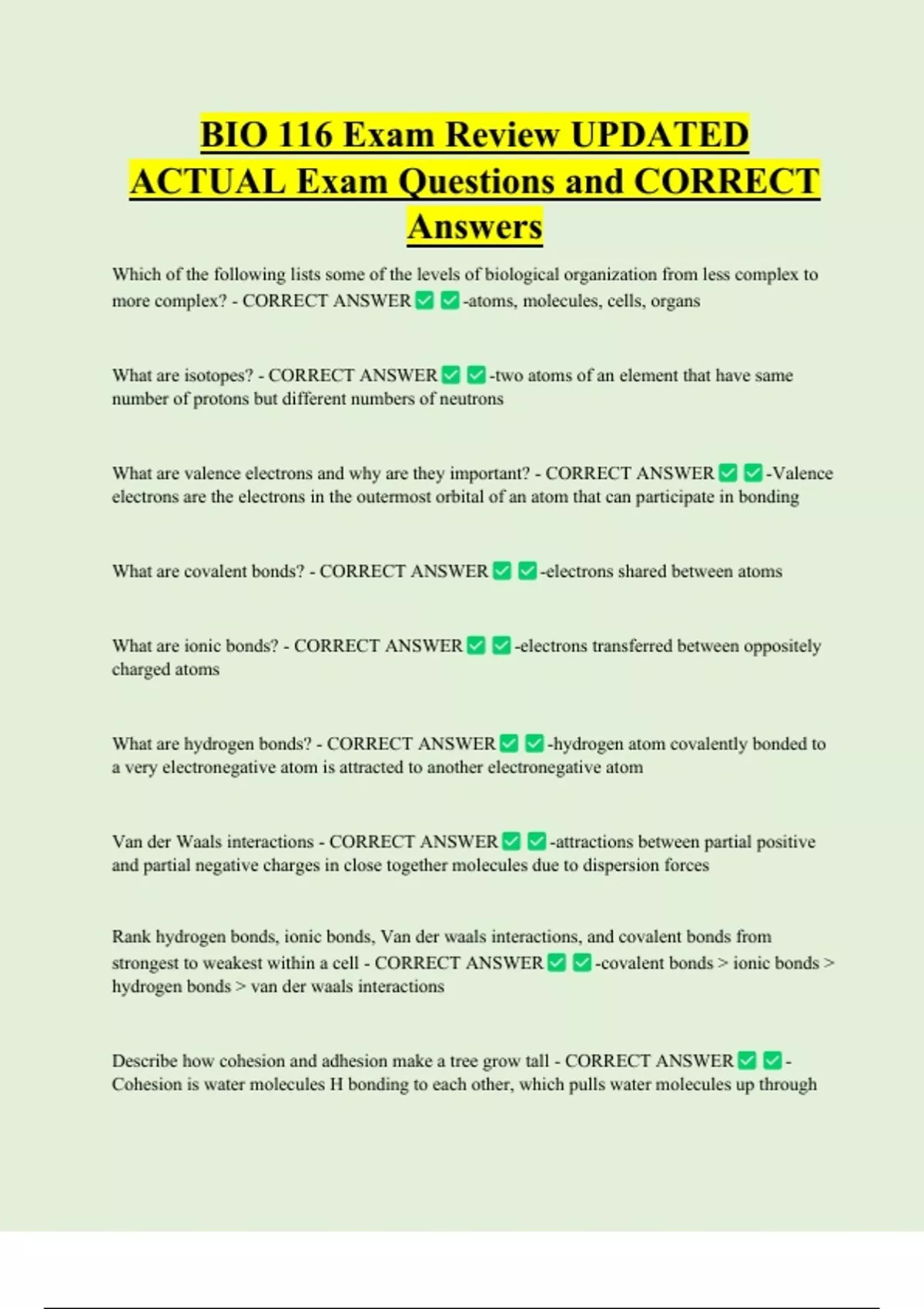 BIO 116 Exam Review UPDATED ACTUAL Exam Questions and CORRECT Answers Which of the following lists some of the levels of biological organization from less complex to more complex? - CORRECT ANSWER -atoms, molecules, cells, organs What are isotopes? - CORRECT ANSWER -two atoms of an element that have same number of protons but different numbers of neutrons What are valence electrons and why are they important? - CORRECT ANSWER -Valence electrons are the electrons in the outermost orbital of an atom that can participate in bondin