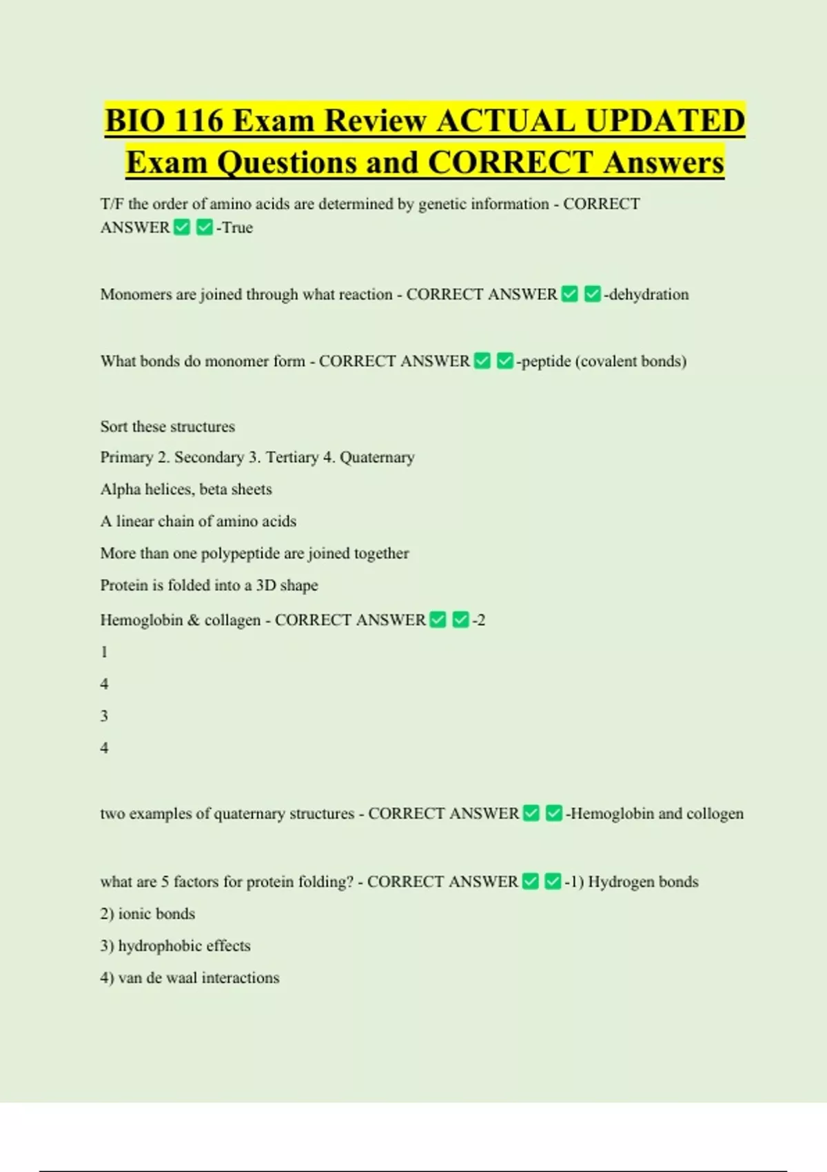 BIO 116 Exam Review ACTUAL UPDATED Exam Questions and CORRECT Answers T/F the order of amino acids are determined by genetic information - CORRECT ANSWER -True Monomers are joined through what reaction - CORRECT ANSWER What bonds do monomer form - CORRECT ANSWER -dehydration -peptide (covalent bonds