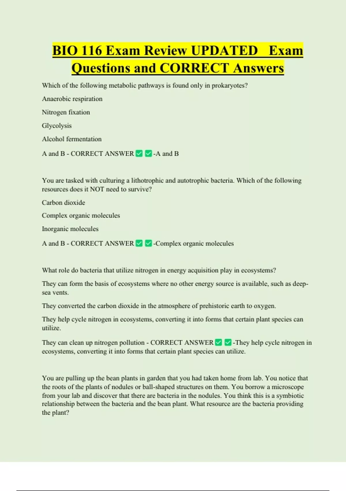 BIO 116 Exam Review UPDATED Exam Questions and CORRECT Answers Which of the following metabolic pathways is found only in prokaryotes? Anaerobic respiration Nitrogen fixation Glycolysis Alcohol fermentation A and B - CORRECT ANSWER -A and B You are tasked with culturing a lithotrophic and autotrophic bacteria. Which of the f