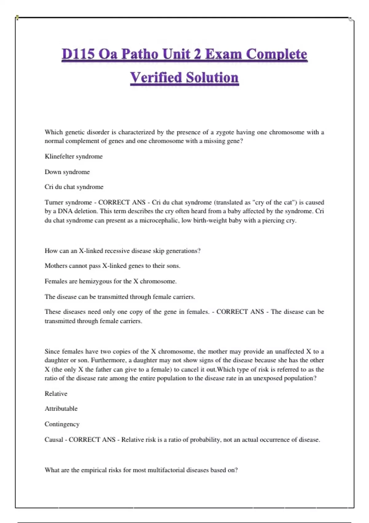Check My Answer - CORRECT ANS - Intellectual disability and fetal miscarriage. Chromosome