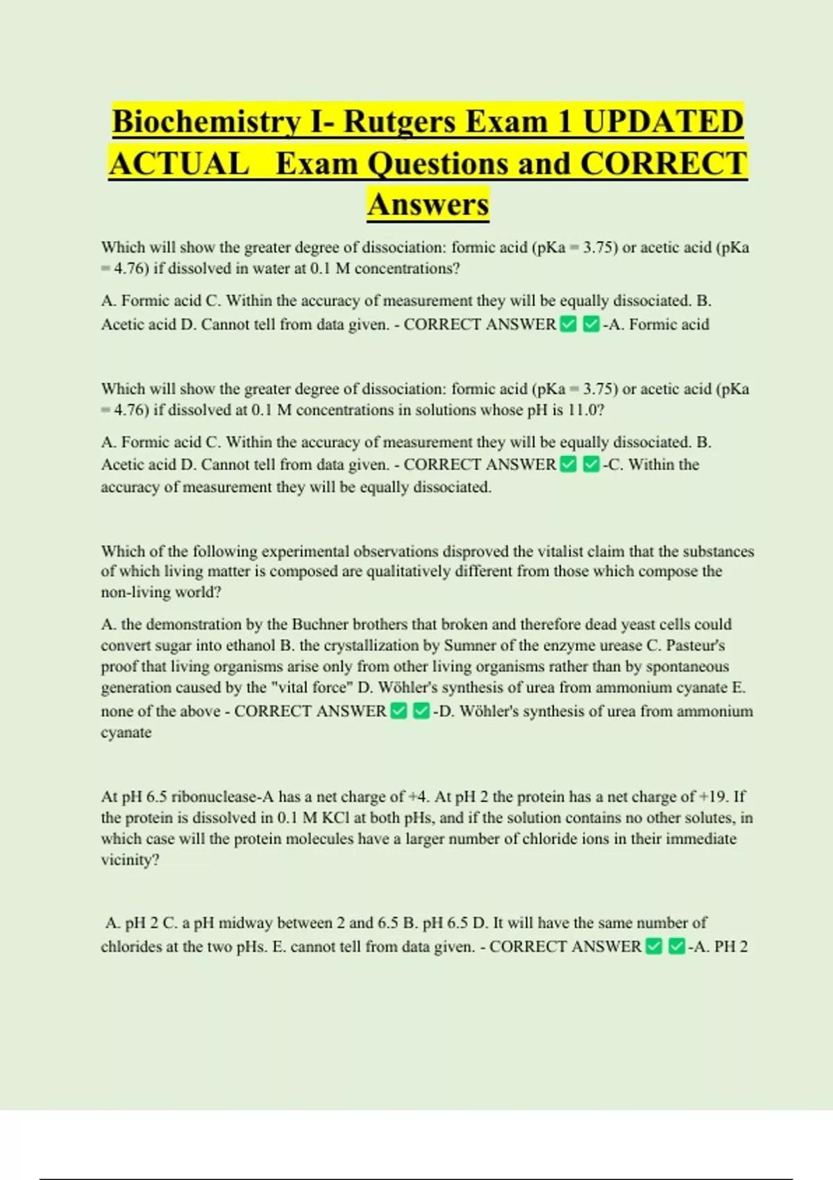 Biochemistry I- Rutgers Exam 1 UPDATED ACTUAL Exam Questions and CORRECT Answers Which will show the greater degree of dissociation: formic acid (pKa = 3.75) or acetic acid (pKa = 4.76) if dissolved in water at 0.1 M concentrations? A. Formic acid C. Within the accuracy of measurement they will be equally dissociated. B. Acetic acid D. Cannot tell from data given. - CORRECT ANSWER -A. Formic acid Which will show the greater degree of dissociation: formic acid (pKa = 3.75) or acetic acid (pKa = 4.76) if dissolved at 0.1 M concentrations in solutions whose pH is 11.0? A. Formic acid C. Within the accuracy of measurement they will be equally dissociated. B. Acetic acid D. Cannot tell from data given. - CORRECT ANSWER -C. Within the accuracy of measurement they will be equally dissociate