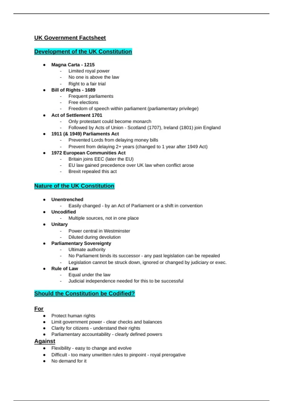 Edexcel A-Level UK Government Paper 1 notes - comprehensive coverage of the constitution, Parliament, Prime Minister and executive, the judiciary, and relationships between branches. Includes clear explanations, key case studies, and in-depth evaluation to strengthen analysis. Organised with colour-coded sections for quick navigation, making revision focused and efficient.