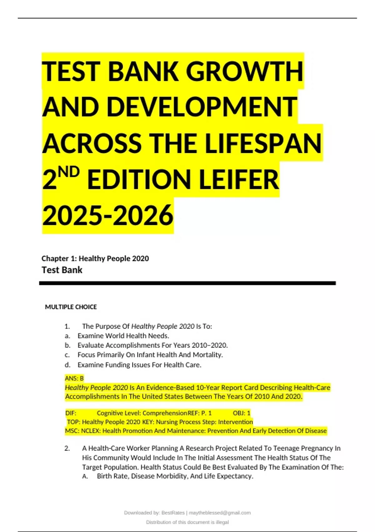 Extensive test bank for Growth and Development Across the Lifespan (2nd Edition, Pamela S. Leifer), containing multiple-choice and application-based questions with correct answers and rationales. Covers all key developmental stages from infancy to older adulthood, including physical, cognitive, psychosocial, and moral development theories. Topics include prenatal growth, newborn adaptation, childhood milestones, adolescent changes, adult transitions, and aging processes. Fully updated for the academic year and ideal for nursing students preparing for exams and NCLEX-style assessments.