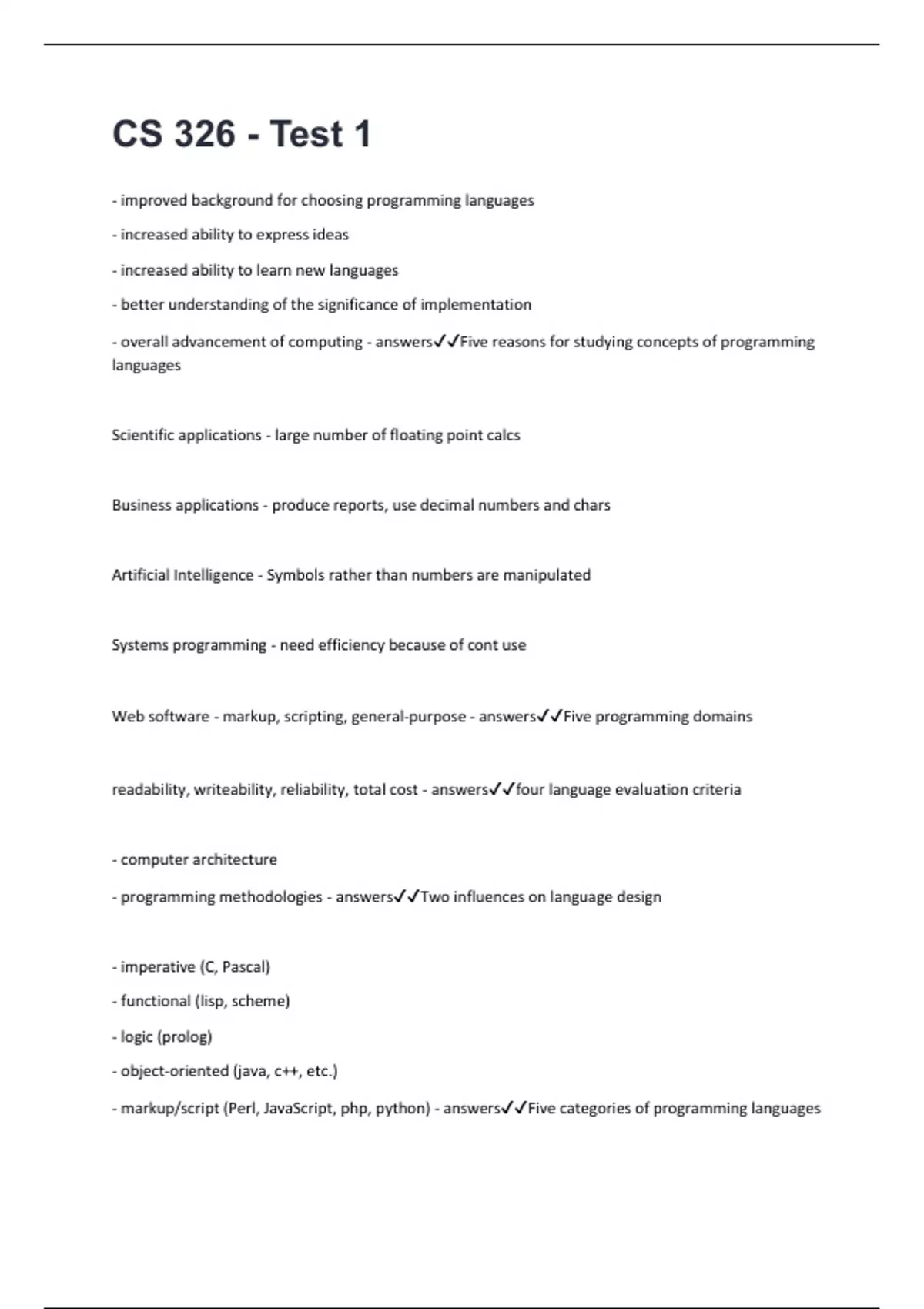 CS 326 - Test 1 - improved background for choosing programming languages - increased ability to express ideas - increased ability to learn new languages - better understanding of the significance of implementation - overall advancement of computing - answersFive reasons for studying concepts of programming languages Scientific applications - large number of floating point calcs Business applications - produce reports, use decimal numbers and chars Artificial Intelligence - Symbols rather than numbers are manipulated Systems programming - need efficiency because of cont use Web software - markup, scripting, general-purpose - answersFive programming domains readability, writeability, reliability, total cost - answersfour language evaluation criteria - computer architecture - programming methodologies - answersTwo influences on language design - imperative (C, Pascal) - functional (lisp, scheme) - logic (prolog) - object-oriented (java, c++, etc.) - markup/script (Perl, JavaScript, php, python) - answersFive categories of programming languages