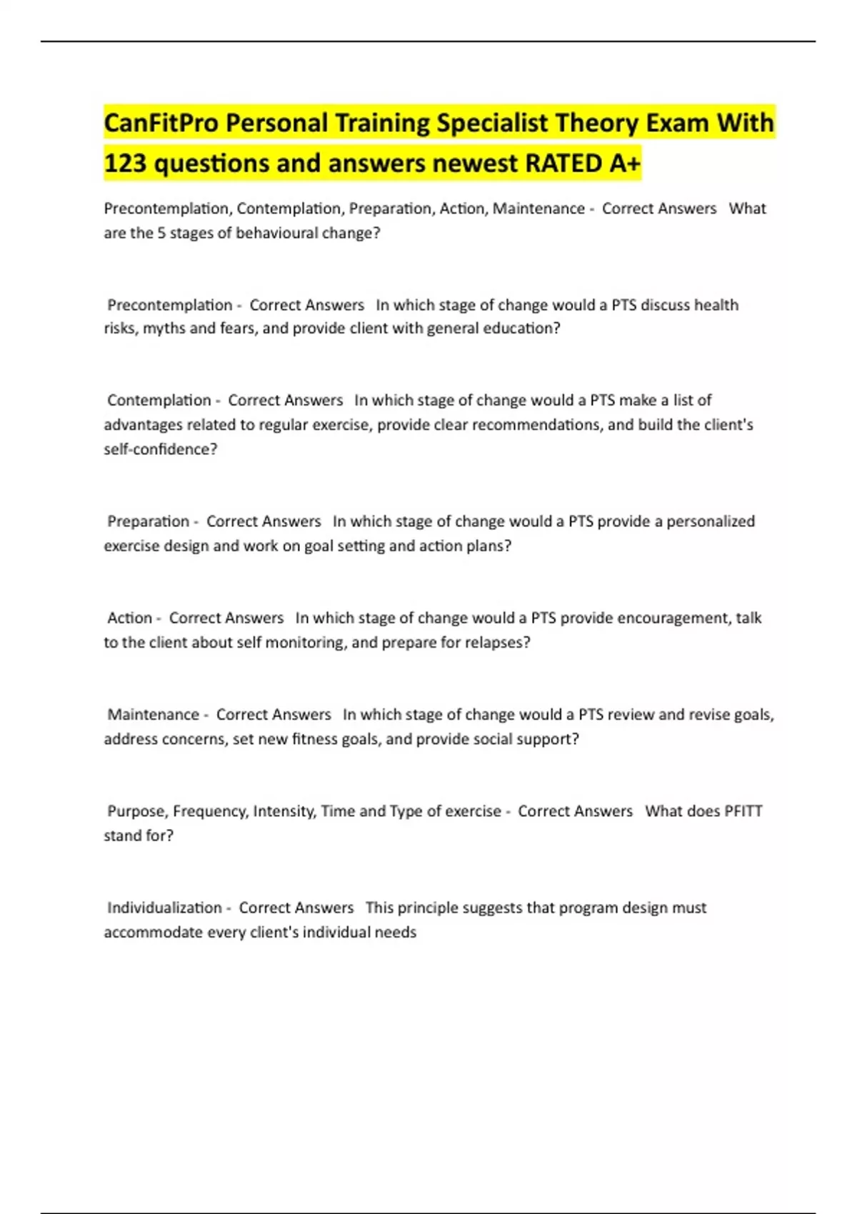 CanFitPro Personal Training Specialist Theory Exam With 123 questions and answers newest RATED A+