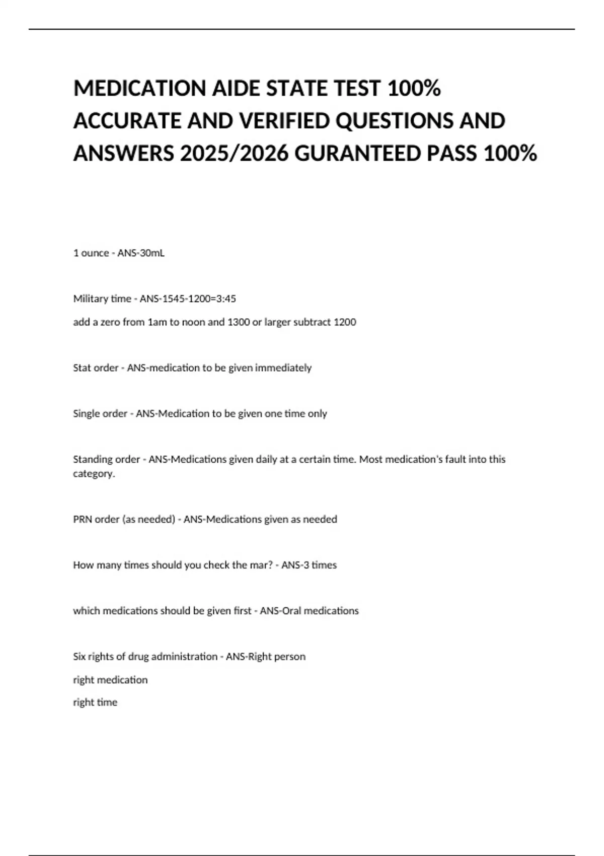 MEDICATION AIDE STATE TEST 100% ACCURATE AND VERIFIED QUESTIONS AND ANSWERS 2025/2026 GURANTEED PASS 100%