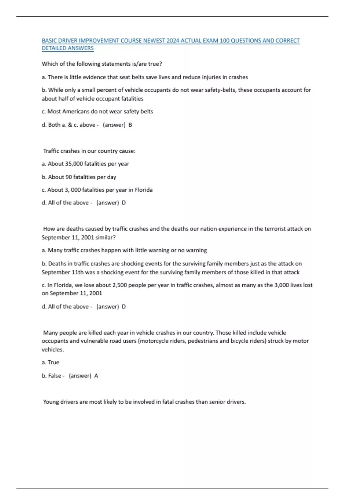 ,BASIC DRIVER IMPROVEMENT COURSE NEWEST 2024 ACTUAL EXAM 100 QUESTIONS AND CORRECT