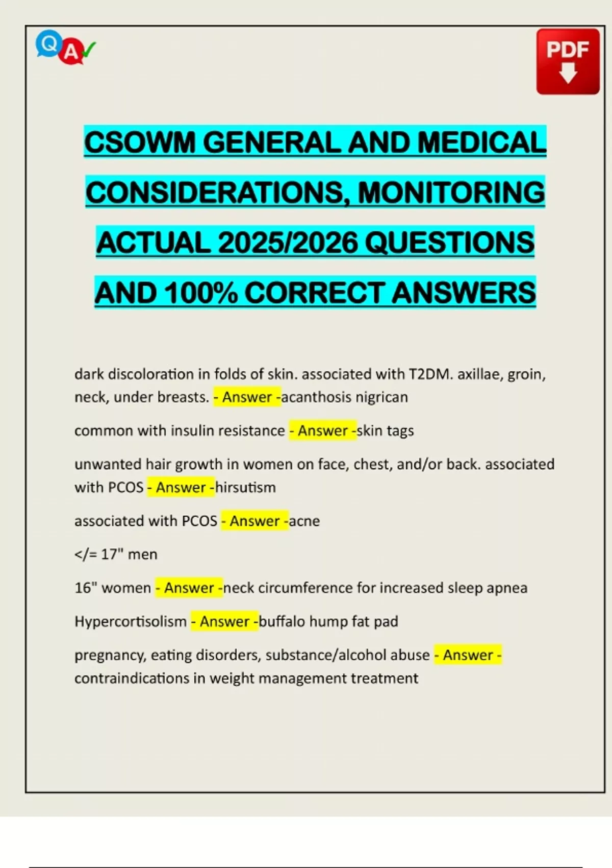 CSOWM GENERAL AND MEDICAL CONSIDERATIONS, MONITORING ACTUAL 2025/2026 QUESTIONS AND 100% CORRECT ANSWERS dark discoloration in folds of skin. associated with T2DM. axillae, groin, neck, under breasts. - Answer -acanthosis nigrican common with insulin resistance - Answer -skin tags unwanted hair growth in women on face, chest, and/or back. associated with PCOS - Answer -hirsutism associated with PCOS - Answer -acne </= 17" men 16" women - Answer -neck circumference for increased sleep apnea Hypercortisolism - Answer -buffalo hump fat pad pregnancy, eating disord