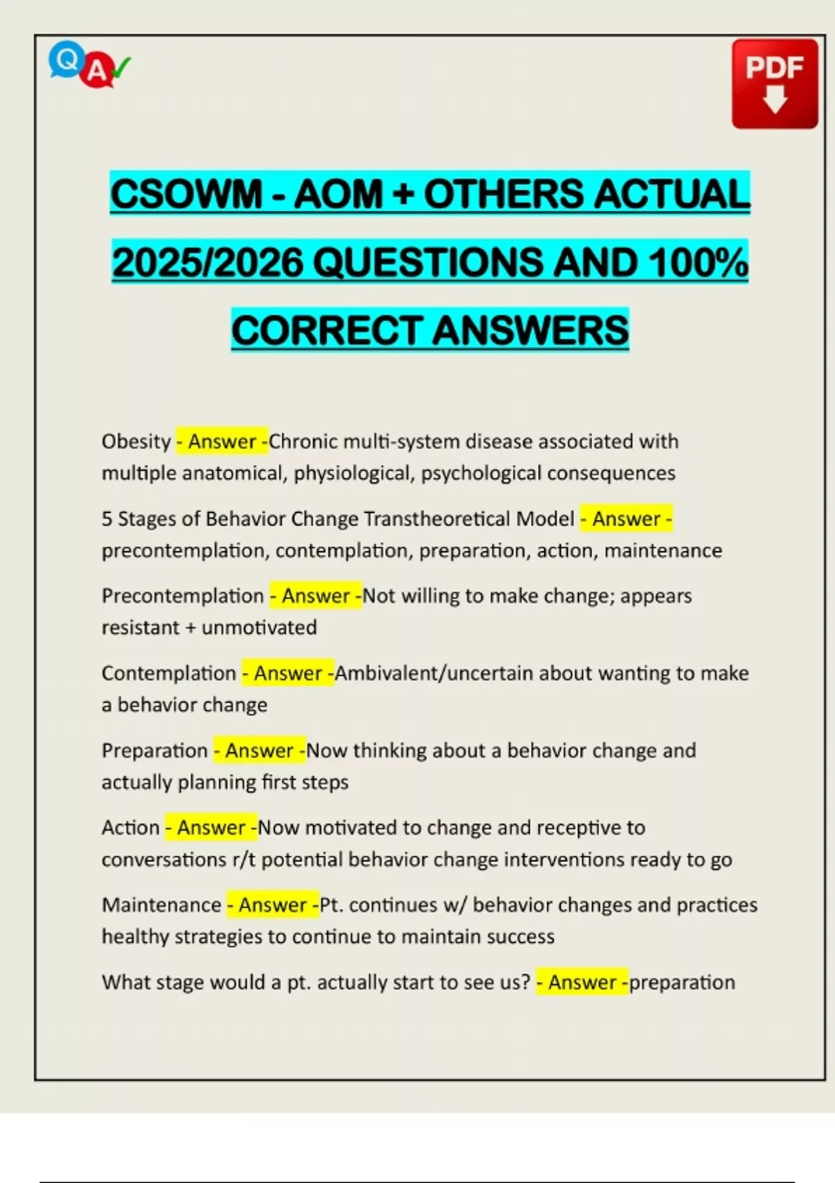 CSOWM - AOM + OTHERS ACTUAL 2025/2026 QUESTIONS AND 100% CORRECT ANSWERS Obesity - Answer -Chronic multi-system disease associated with multiple anatomical, physiological, psychological consequences 5 Stages of Behavior Change Transtheoretical Model - Answer - precontemplation, contemplation, preparation, action, maintenance Precontemplation - Answer -Not willing to make change; appears resistant + unmotivated Contemplation - Answer -Ambivalent/uncertain about wanting to make a behavior change Preparation - Answer -Now thinking about a behavior change and actually planning first steps Action - Answer -Now motivated to change and receptive to conversations r/t potential behavior change interventions ready to go Maintenance - Answer -Pt. continues w/ behavior changes and practices healthy strategies to continue to
