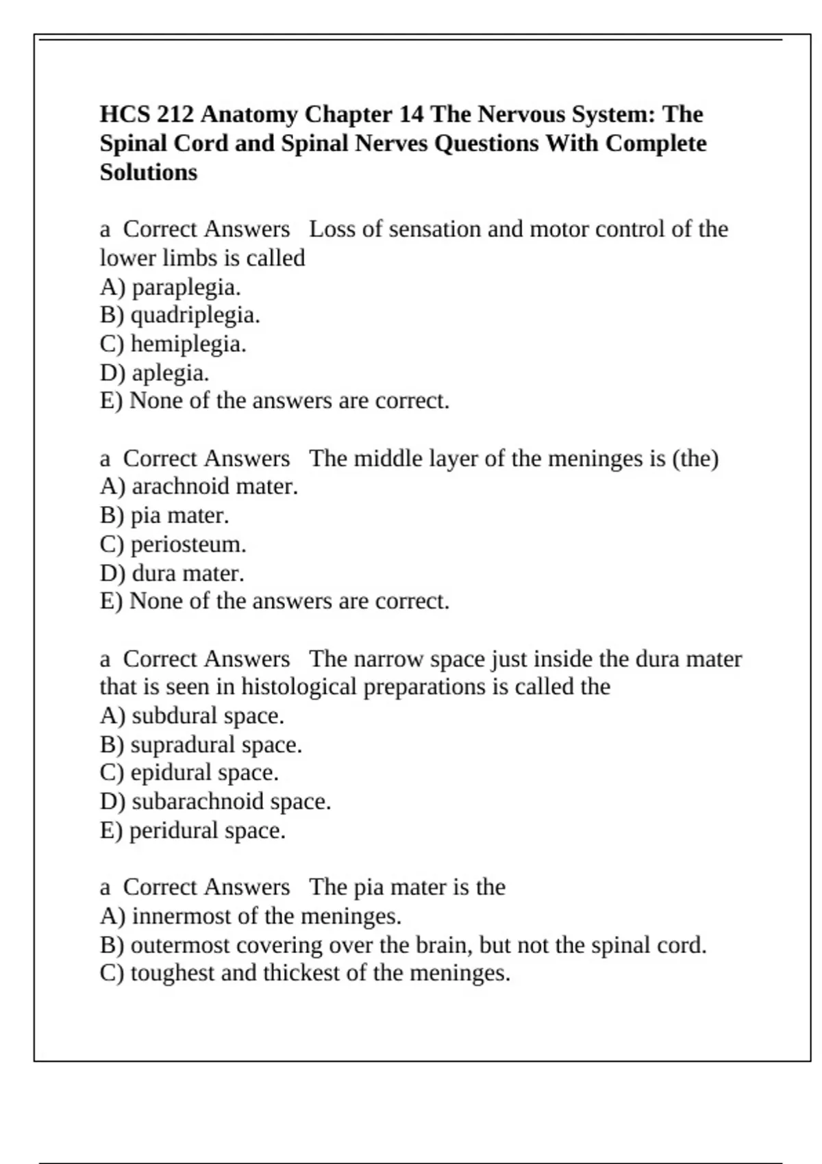 a Correct Answers The pia mater is the