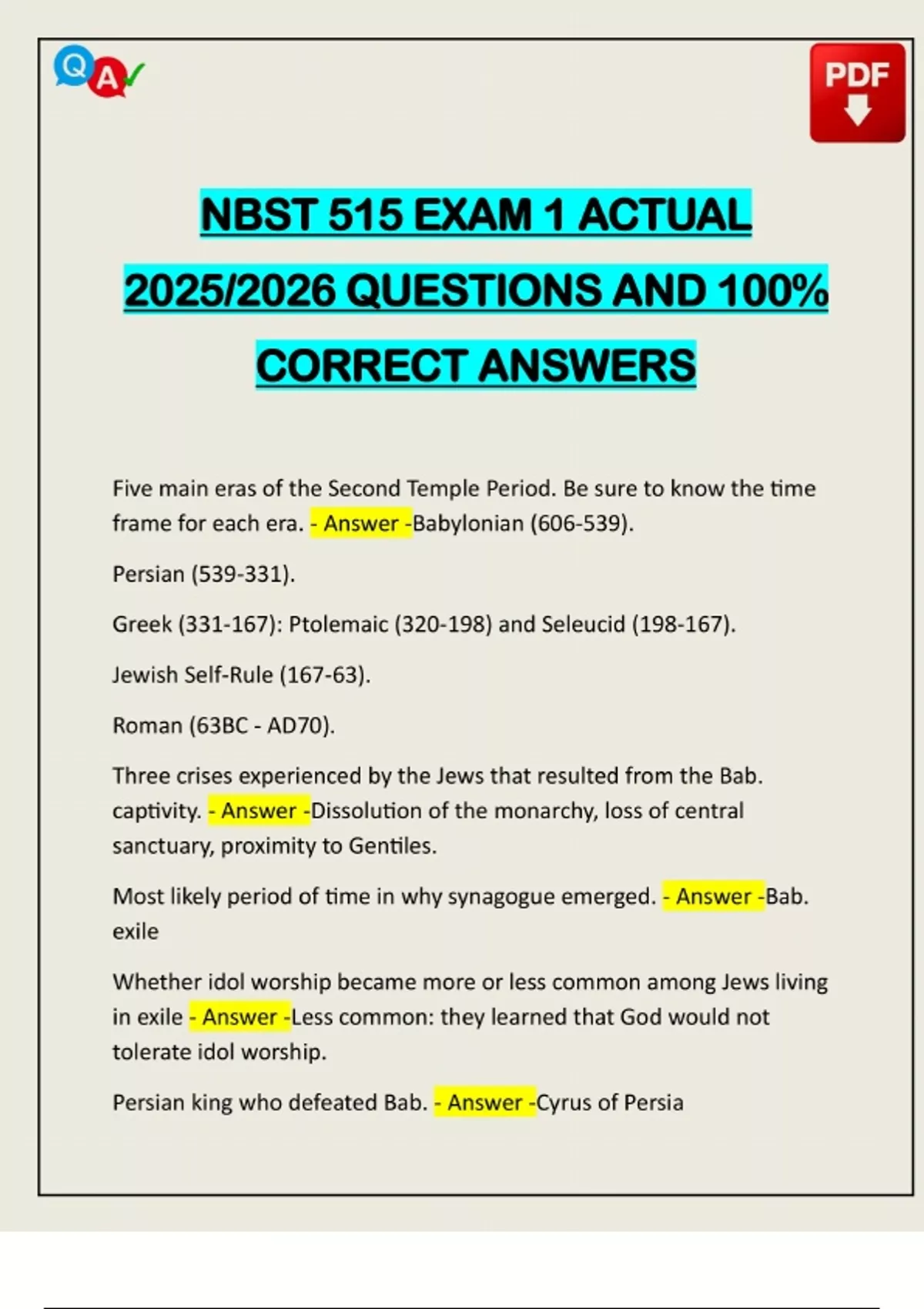 NBST 515 EXAM 1 ACTUAL 2025/2026 QUESTIONS AND 100% CORRECT ANSWERS Five main eras of the Second Temple Period. Be sure to know the time frame for each era. - Answer -Babylonian (606-539). Persian (539-331). Greek (331-167): Ptolemaic (320-198) and Seleucid (198-167). Jewish Self-Rule (167-63). Roman (63BC - AD70). Three crises experienced by the Jews that resulted from the Bab. captivity. - Answer -Dissolution of the monarchy, loss of central sanctuary, proximity to Gentiles. Most likely period of time in why synagogue emerged. - Answer -Bab. exile Whether idol worship became more or less common among Jews living in exile - Answer -Less common: they learned that God would not tolerate idol worship. Persian king who defeated Bab