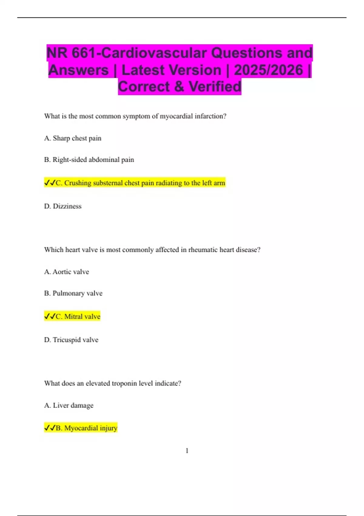 NR 661-Cardiovascular Questions and Answers | Latest Version | 2025/2026 | Correct & Verified What is the most common symptom of myocardial infarction? A. Sharp chest pain B. Right-sided abdominal pain C. Crushing substernal chest pain radiating to the left arm D. Dizziness Which heart valve is most commonly affected in rheumatic heart disease? A. Aortic valve B. Pulmonary valve C. Mitral valve D. Tricuspid valve What does an elevated troponin level indicate? A. Liver damage B. Myocardial injury 2 C. Kidney failure D. Stroke Which of the following is a typical finding in left-sided heart failure? A. Peripheral edema B. Jugular venous distension C. Pulmonary congestion and dyspnea D. Hepatomegaly What is the first-line medication class used to manage hypertension? A. Beta blockers B. Calcium channel blockers C. Thiazide diuretics D. ACE inhibitors Which of the following ECG changes is most indicative of acute myocardial infarction? A. Prolonged PR interval B. ST segment elevation 3 C. Flattened T waves D. QRS widening What is the primary action of beta-blockers in cardiovascular disease? A. Increase heart rate B. Dilate peripheral vessels C. Decrease heart rate and myocardial oxygen demand D. Increase contractility Which symptom is most common in patients with atrial fibrillation? A. Chest pain B. Palpitations C. Syncope D. Headache Which physical exam finding suggests right-sided heart failure? A. Crackles in lungs B. Jugular venous distension 4 C. Tachypnea D. Cyanosis What is the mechanism of action of ACE inhibitors? A. Beta receptor blockade B. Calcium channel blockade C. Inhibit conversion of angiotensin I to angiotensin II D. Diuretic effect Which lipid abnormality is a major risk factor for coronary artery disease? A. High HDL cholesterol B. Low LDL cholesterol C. High LDL cholesterol D. High triglycerides Which medication is used to acutely relieve chest pain in angina? A. Beta-blockers B. Aspirin 5 C. Nitroglycerin D. Statins What is the most common cause of congestive heart failure? A. Valvular disease B. Ischemic heart disease C. Pulmonary embolism D. Myocarditis Which cardiac biomarker rises earliest after myocardial infarction? A. Creatine kinase (CK-MB) B. Troponin I or T C. Myoglobin D. Lactate dehydrogenase What heart sound is associated with ventricular failure? A. S1 B. S2 6 C. S3 gallop