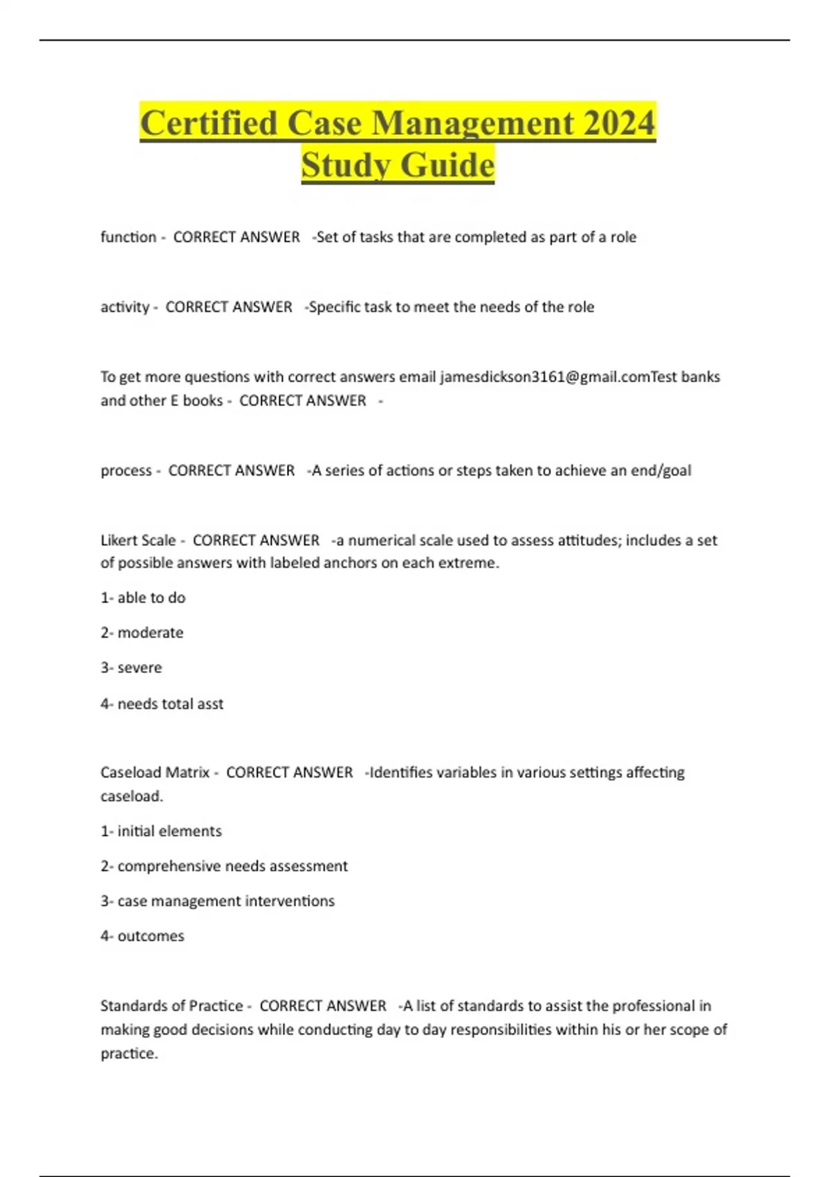 Certified Case Management 2024 Study Guide function - CORRECT ANSWER -Set of tasks that are completed as part of a role activity - CORRECT ANSWER -Specific task to meet the needs of the role To get more questions with correct answers email jamesdickson3161@Test banks and other E books - CORRECT ANSWER - process - CORRECT ANSWER -A series of actions or steps taken to achieve an end/goal Likert Scale - CORRECT ANSWER -a numerical scale used to assess attitudes; includes a set of possible answers with labeled anchors on each extreme. 1- able to do 2- moderate 3- severe 4- needs total asst Caseload Matrix - CORRECT ANSWER -Identifies variables in various settings affecting caseload. 1- initial elements 2- comprehensive needs assessment 3- case management interventions 4- outcomes Standards of Practice - CORRECT ANSWER -A list of standards to assist the professional in making good decisions while conducting day to day responsibilities within his or her scope of practice.